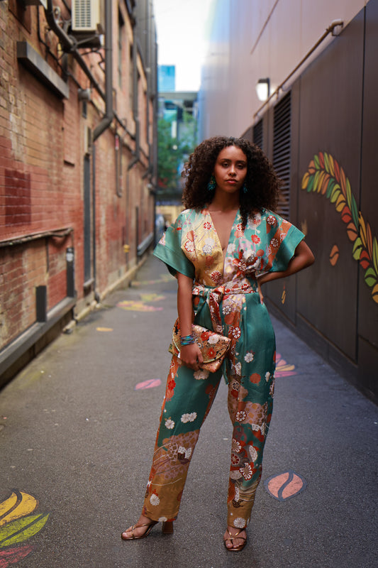 Aqua and Gold Blossoms Kimono Jumpsuit