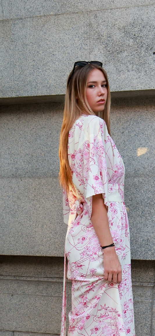 Ivory and Pink Japanese Floral Maxi Dress