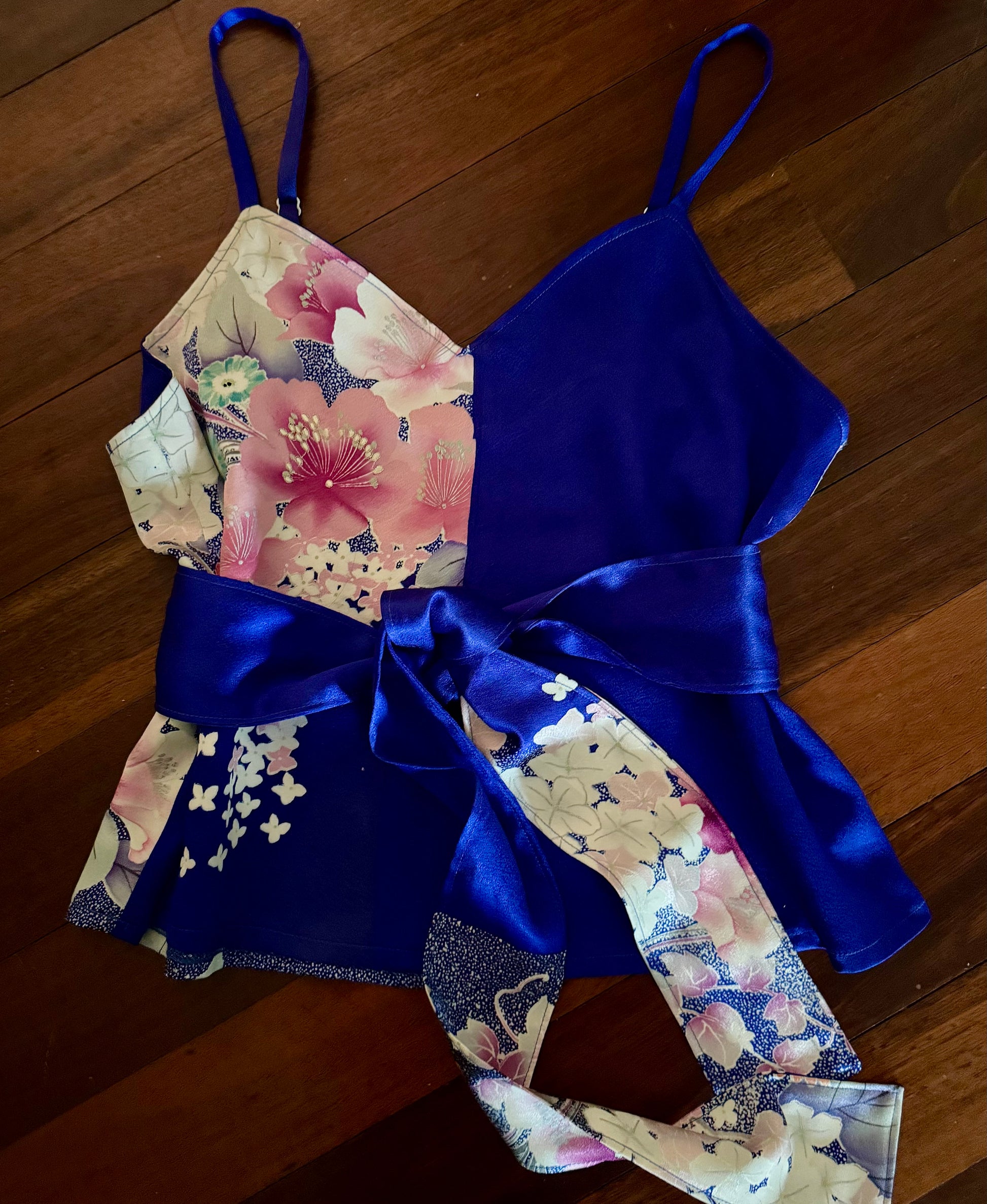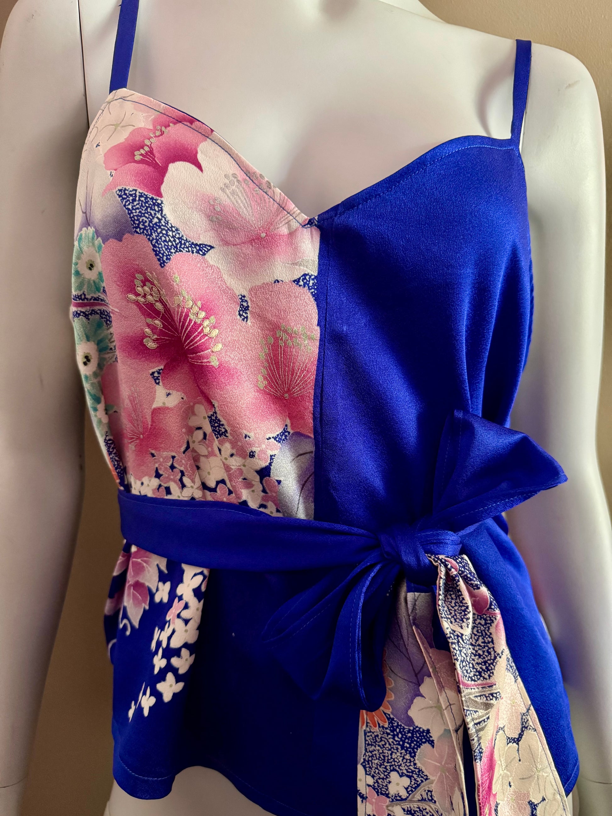This one-of-a-kind camisole is repurposed from a vintage silk Kimono in azure blue with pink blossoms and white hydrangeas, with highlights of metallic silver. The back of this camisole is a plain azure also from the same vintage silk kimono. It has adjustable straps.