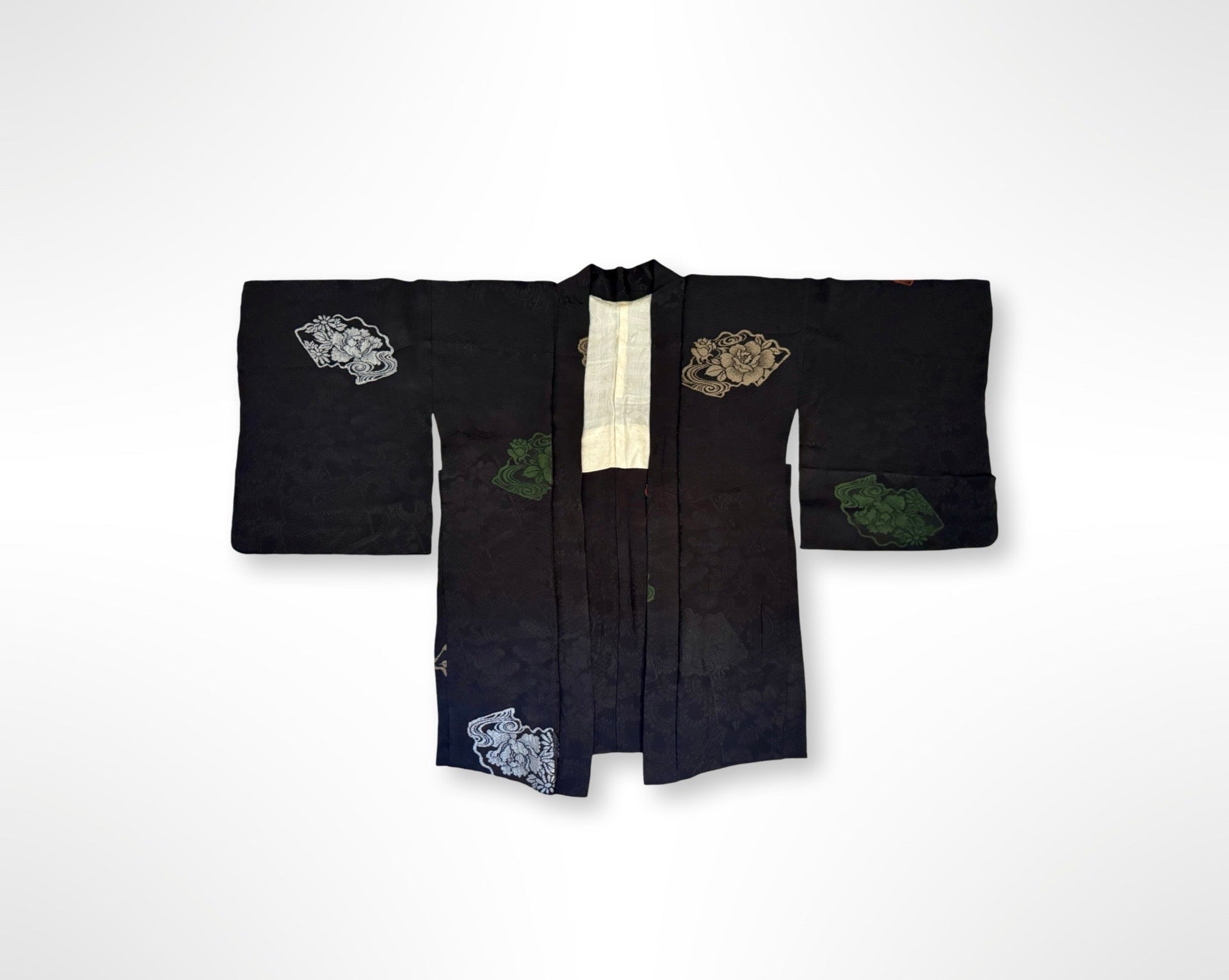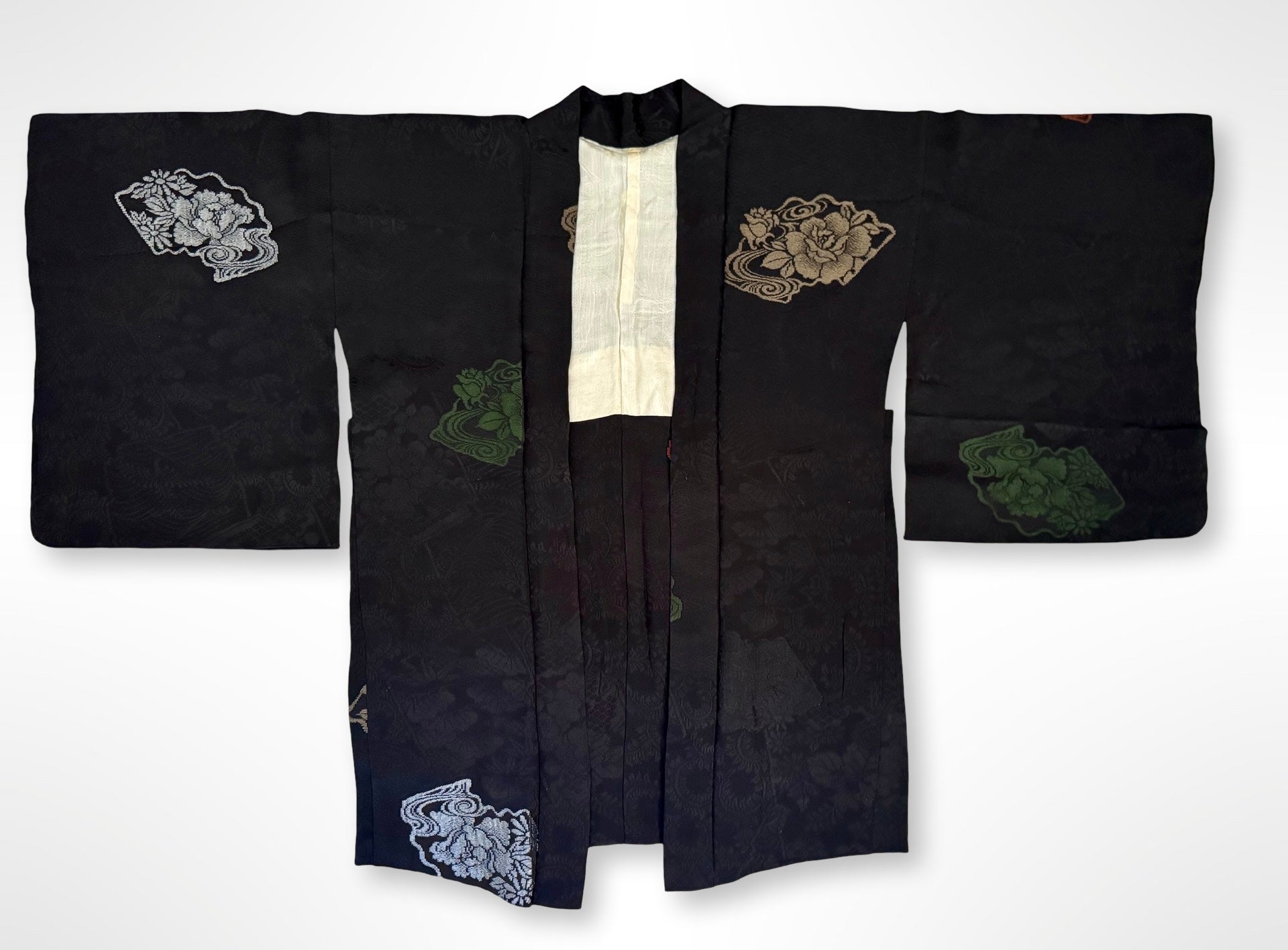 Gorgeous black flowy vintage silk Haori jacket with peonies in autumn colour tones.