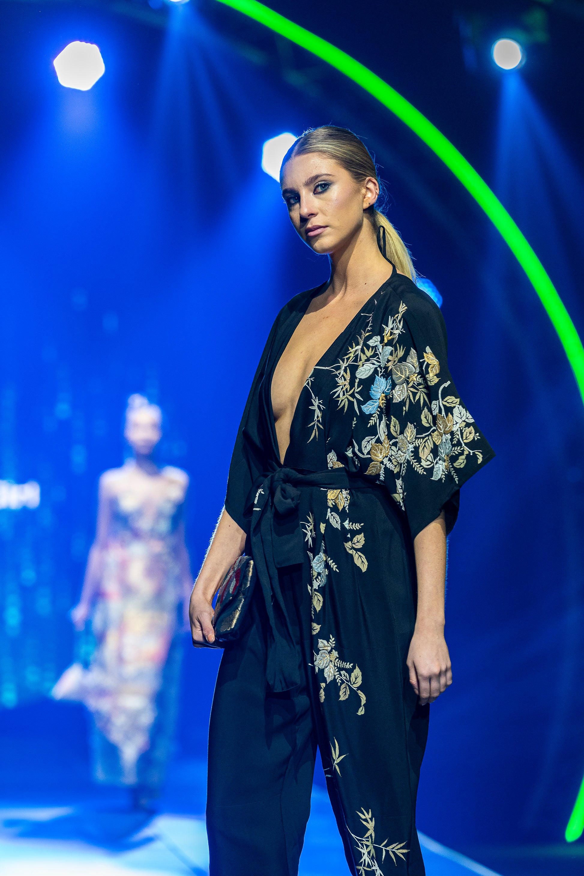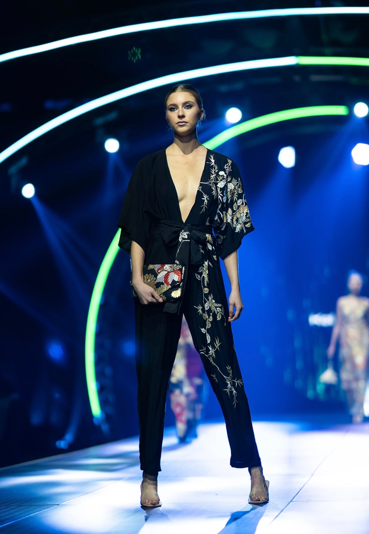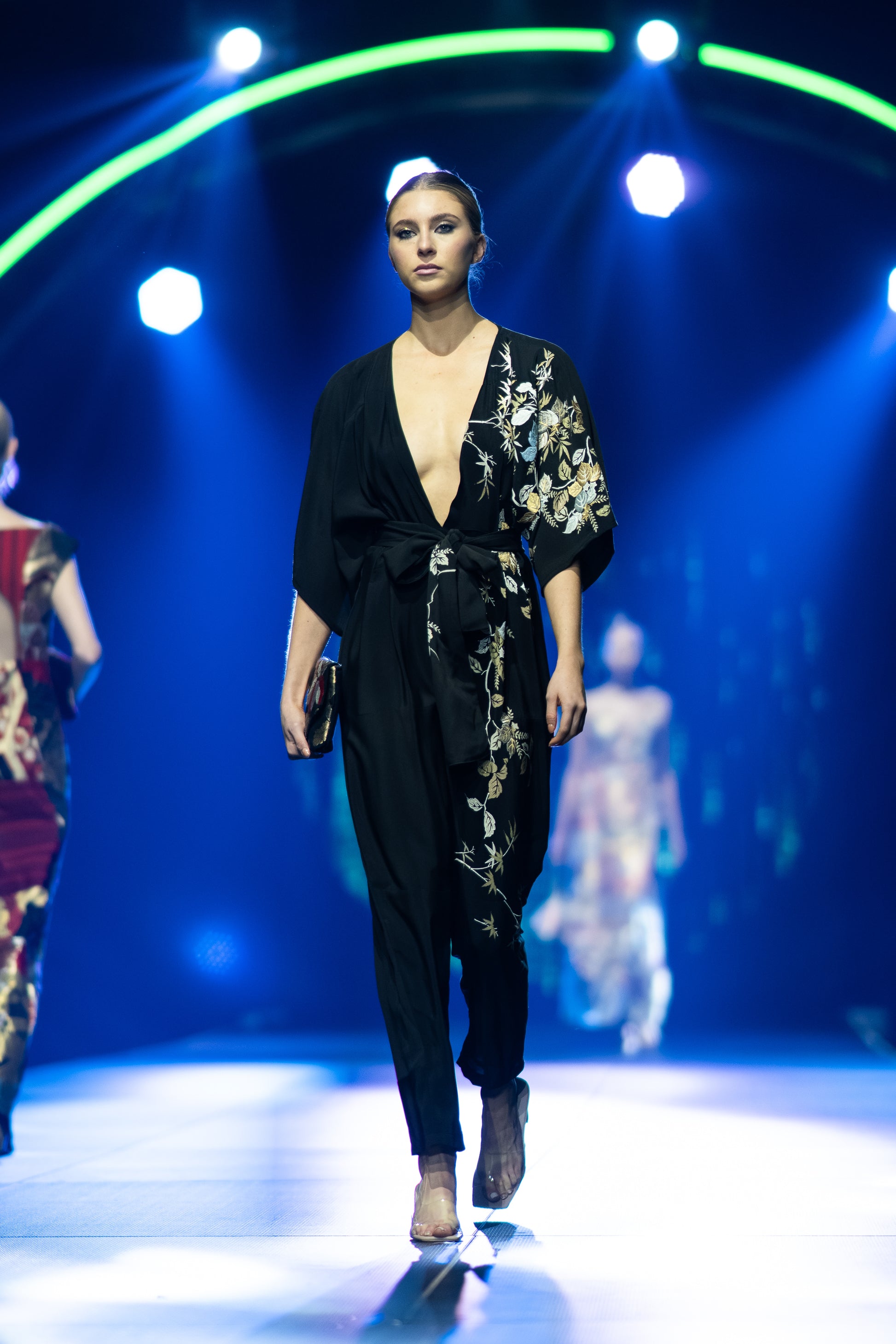 A black with metallic embroidered floral and leaves Jumpsuit, repurposed from a vintage silk Tomosode kimono. There are highlights of sky blue and 24 carat gold embroidery. This jumpsuit has a tapered leg, and a v-neck line, that can be worn open or made more modest with a hook and eye clasp.