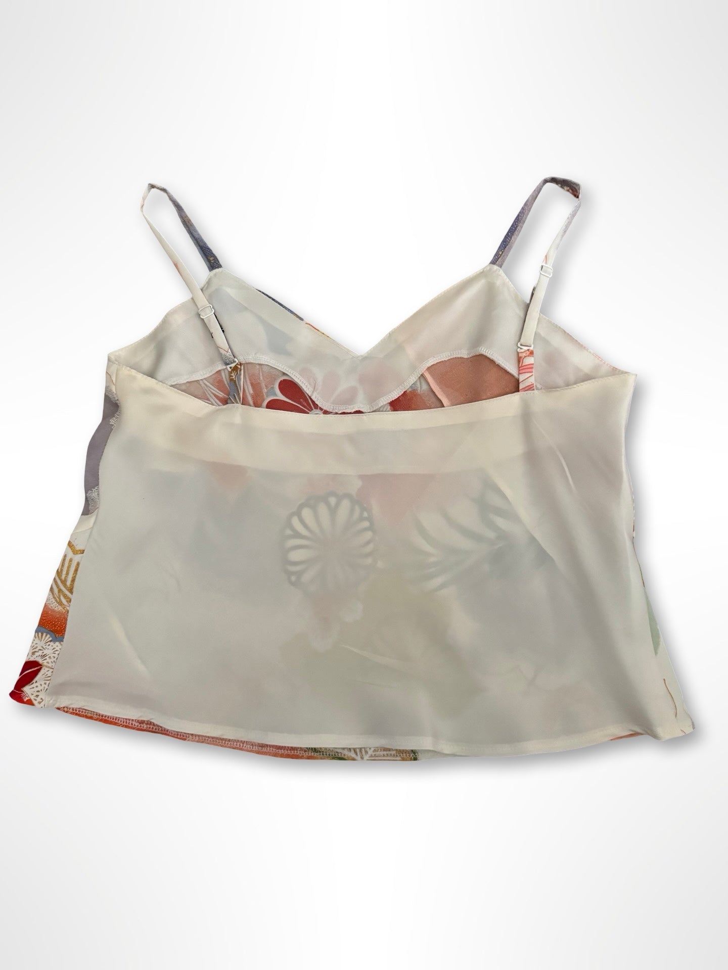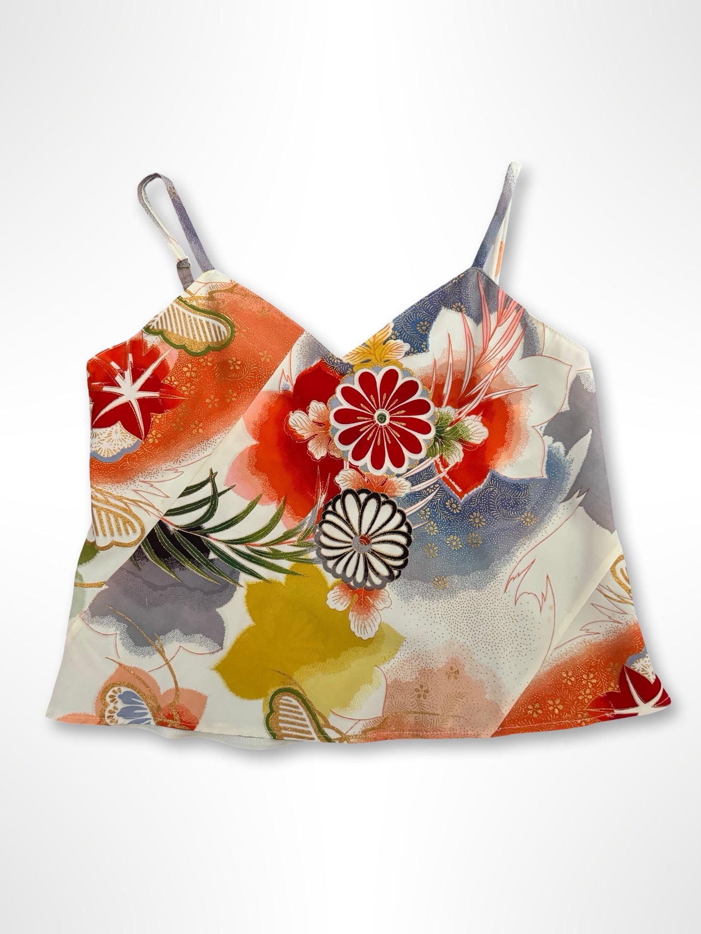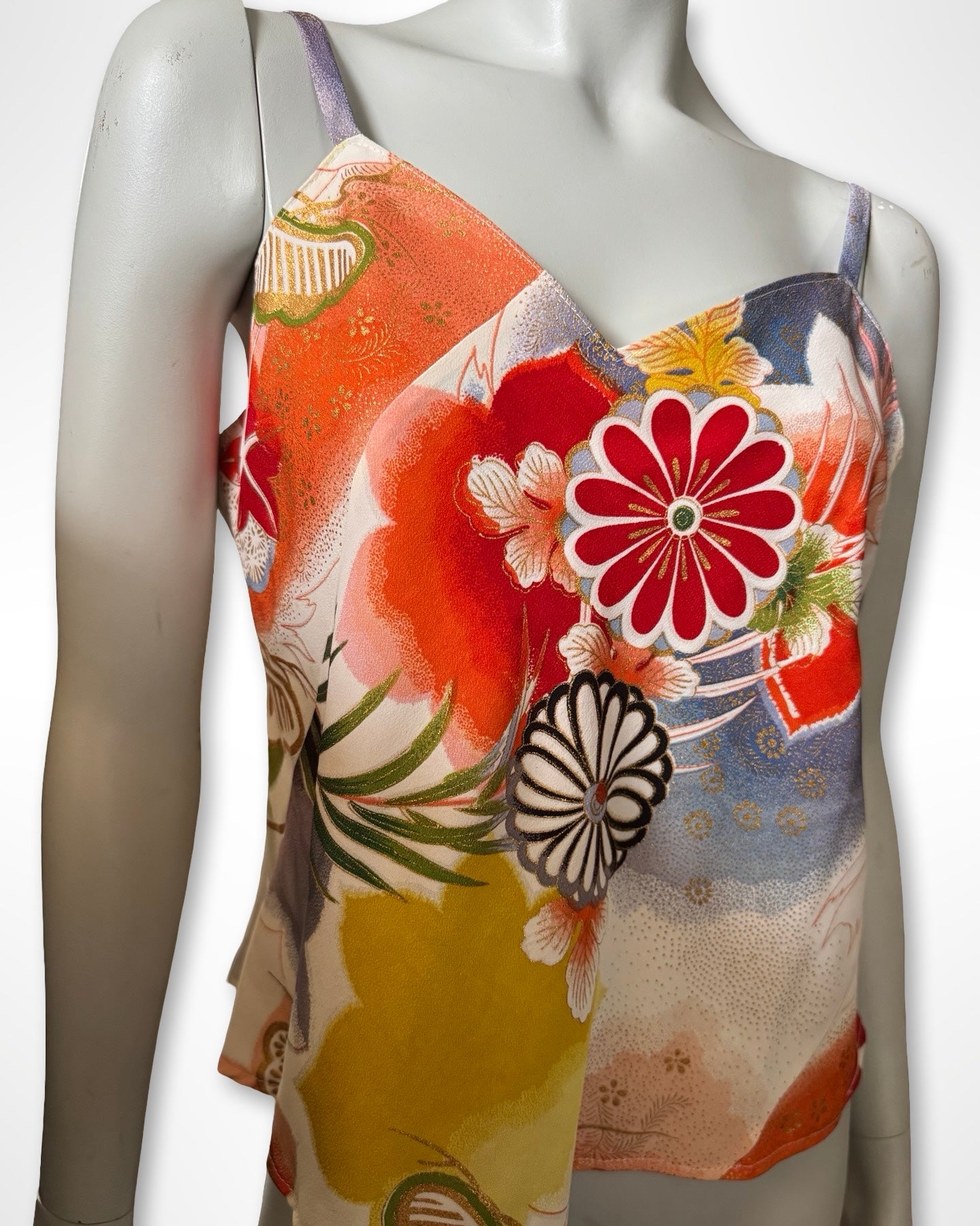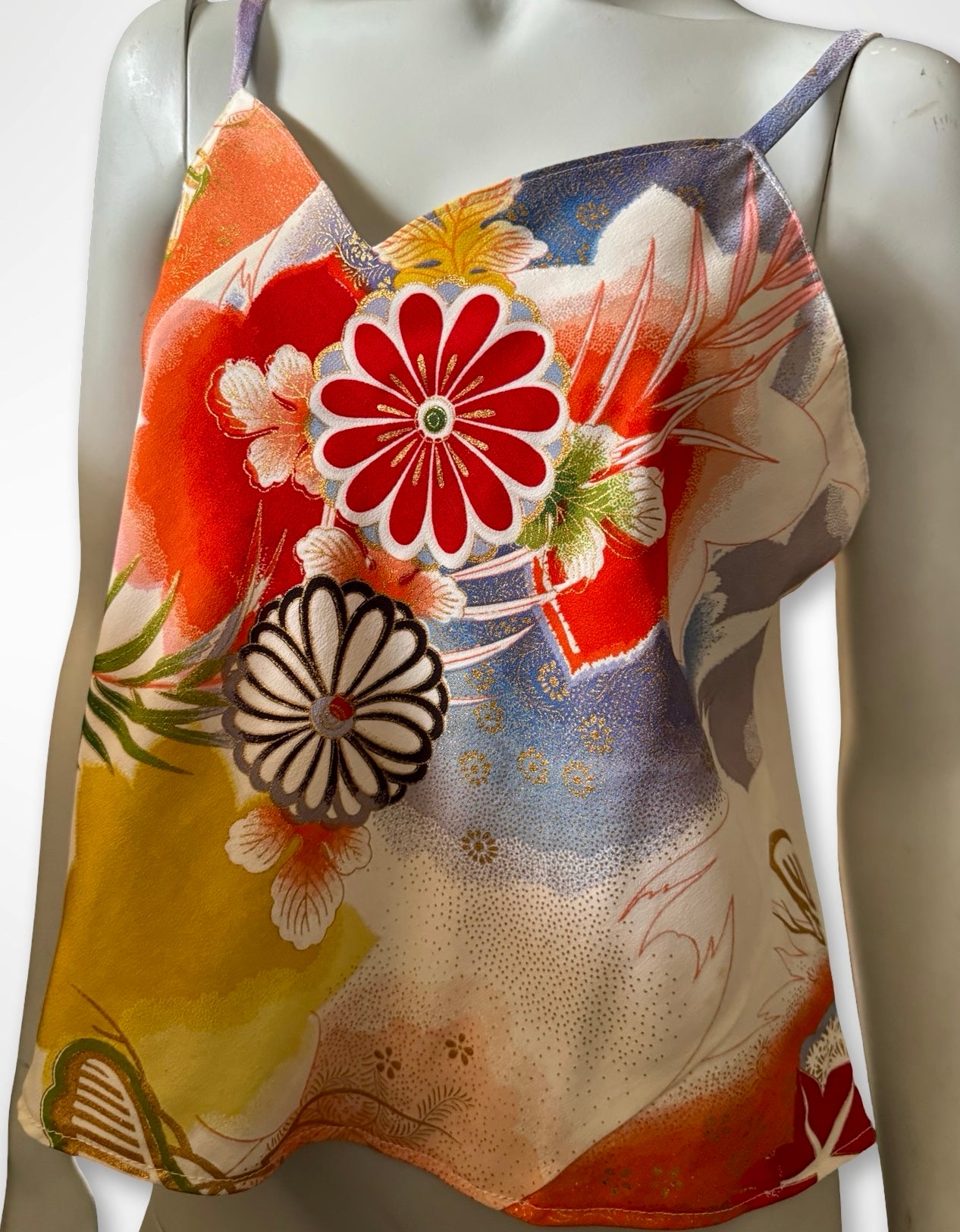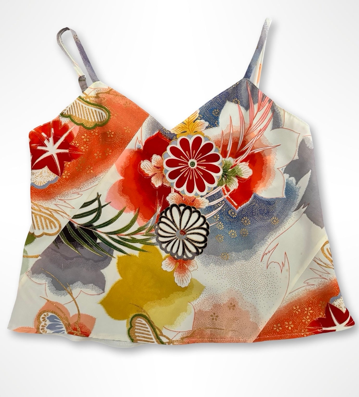 This camisole is repurposed from a vintage silk Kimono, with chrysanthemums and maple leaves. The back of this camisole is a plain ivory silk from a vintage kimono. It has adjustable straps.