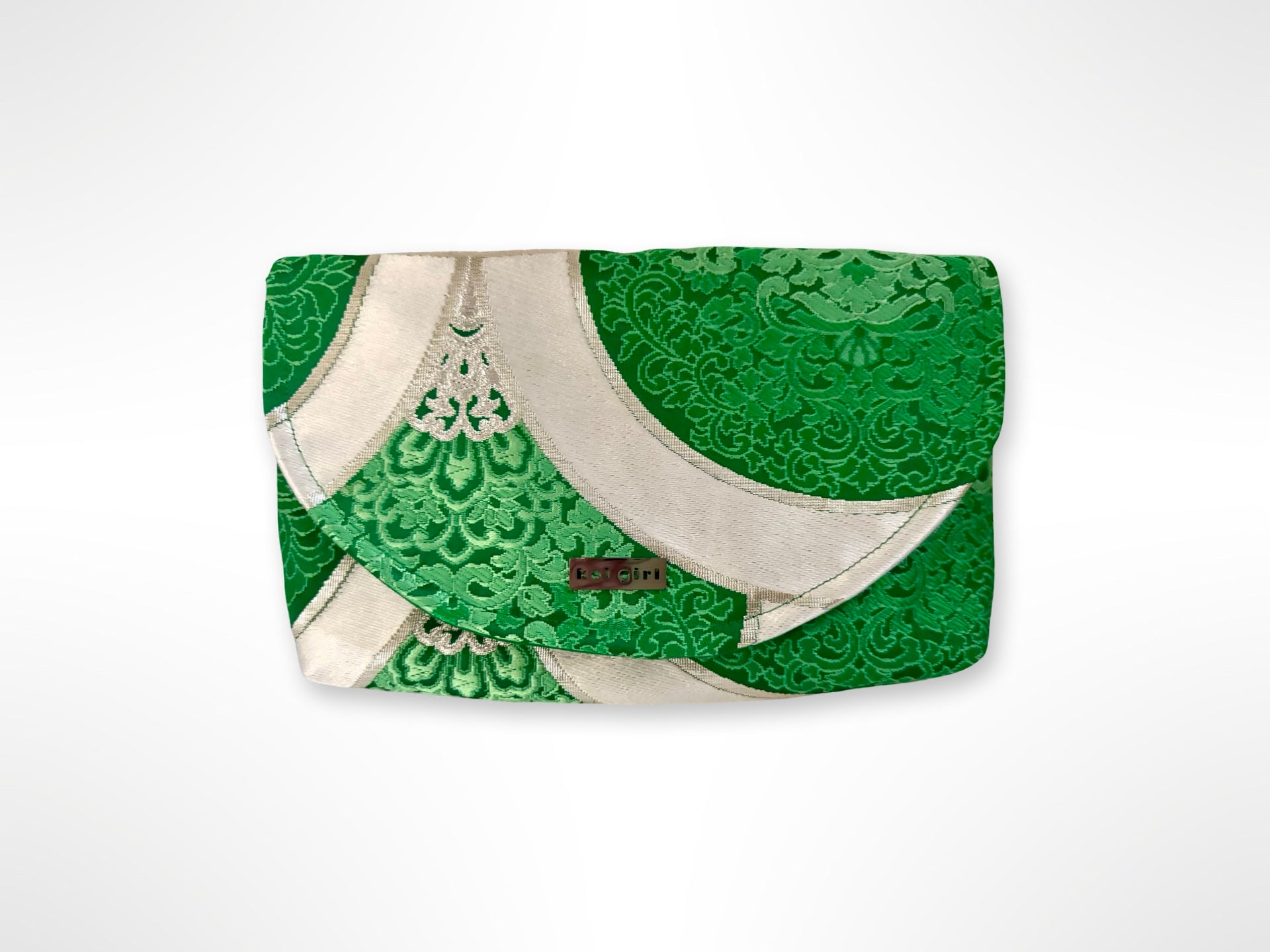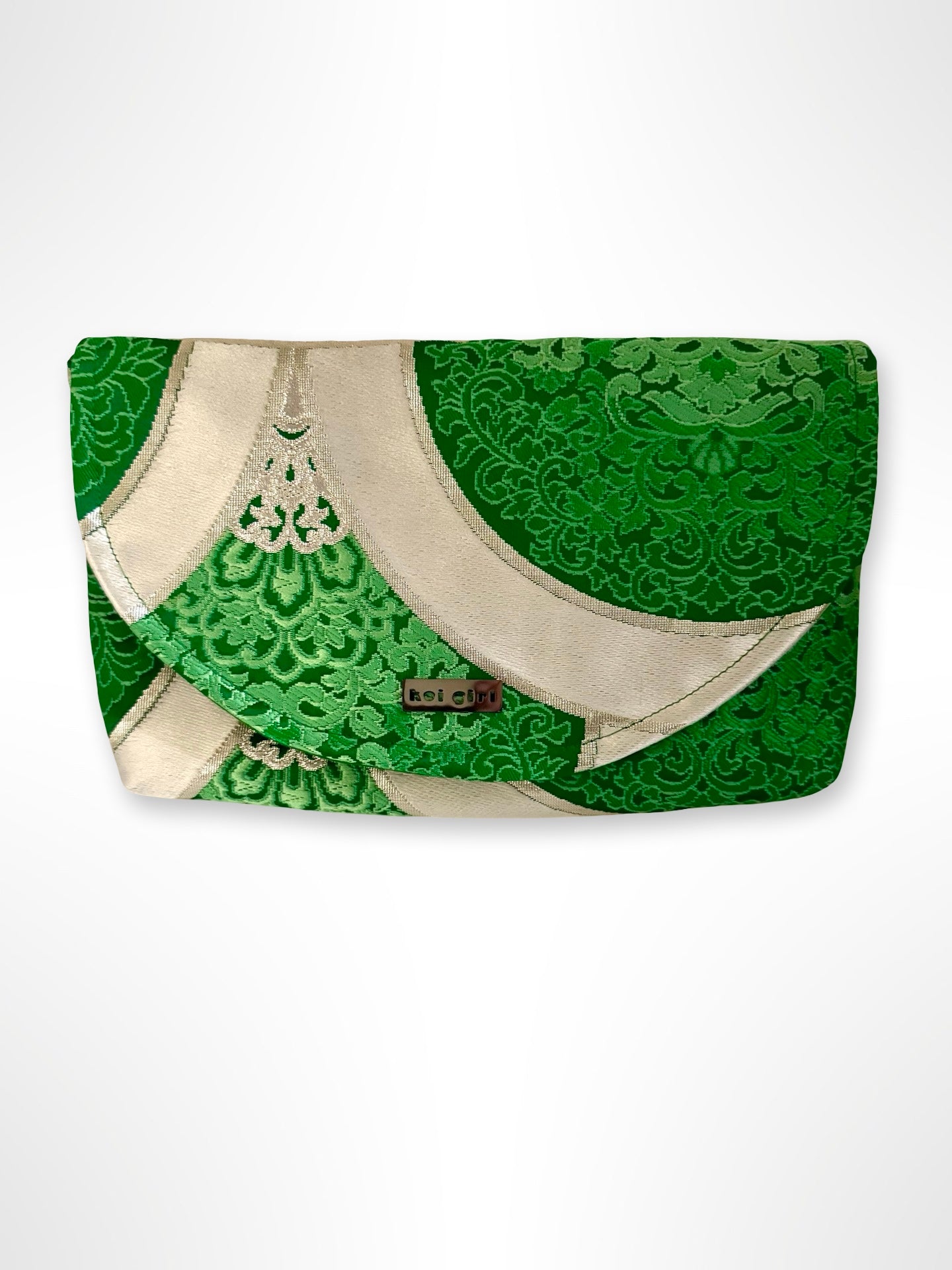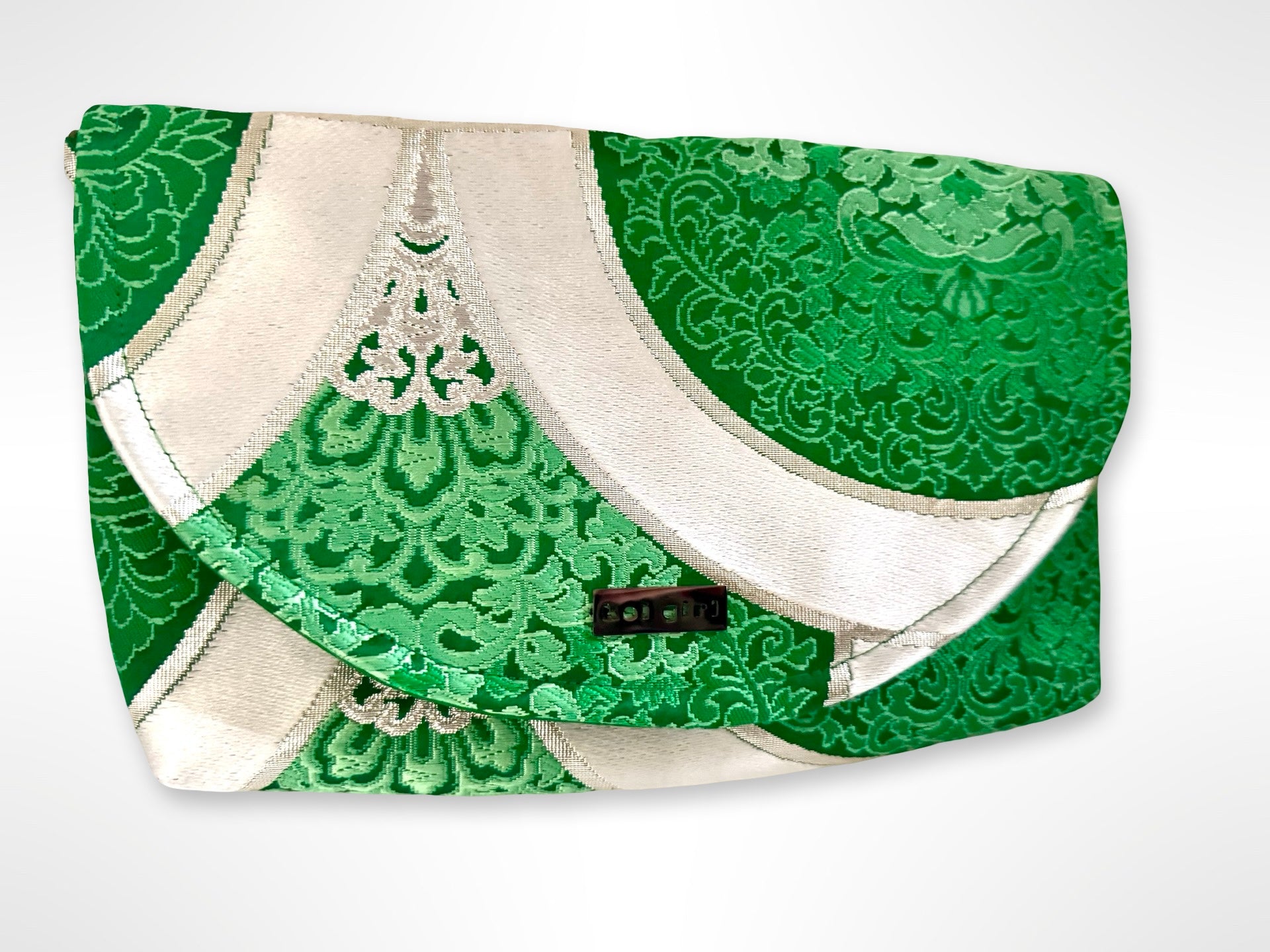 This emerald green clutch purse is crafted and upcycled by repurposing vintage silk obi fabric, making each piece truly unique. Featuring a stunning floral mandala pattern, it’s a timeless accessory that combines traditional Japanese craftsmanship with contemporary style.
