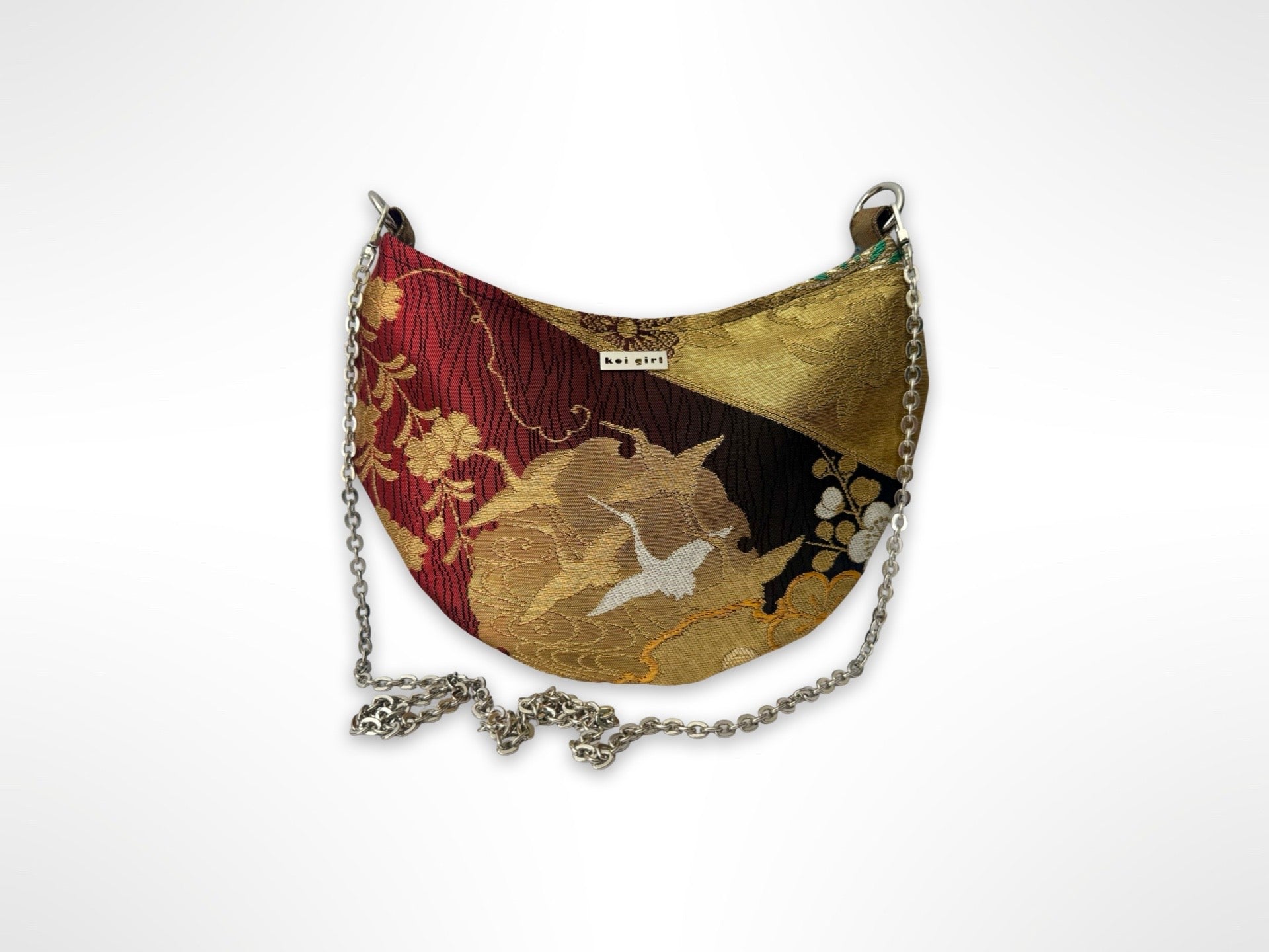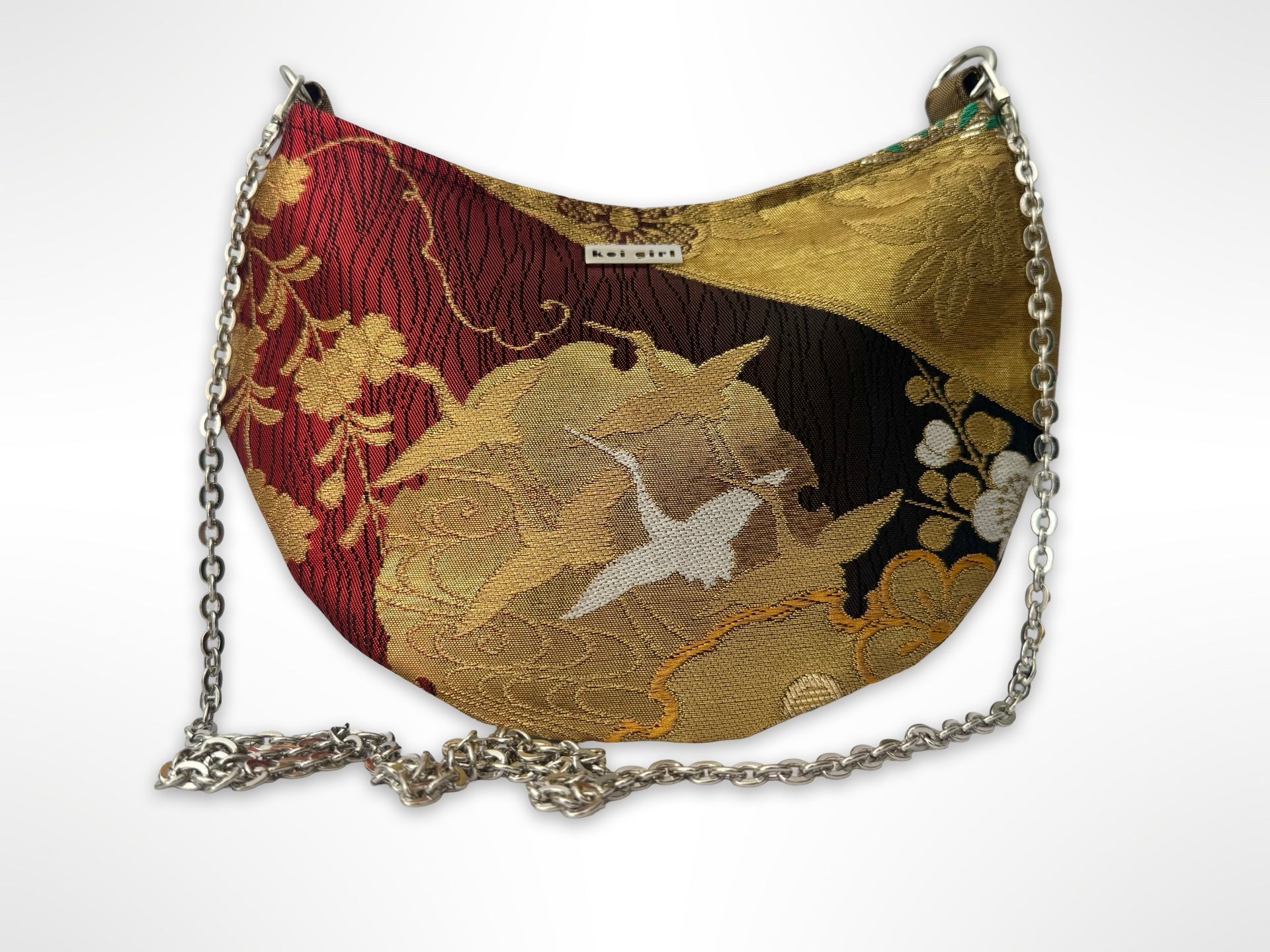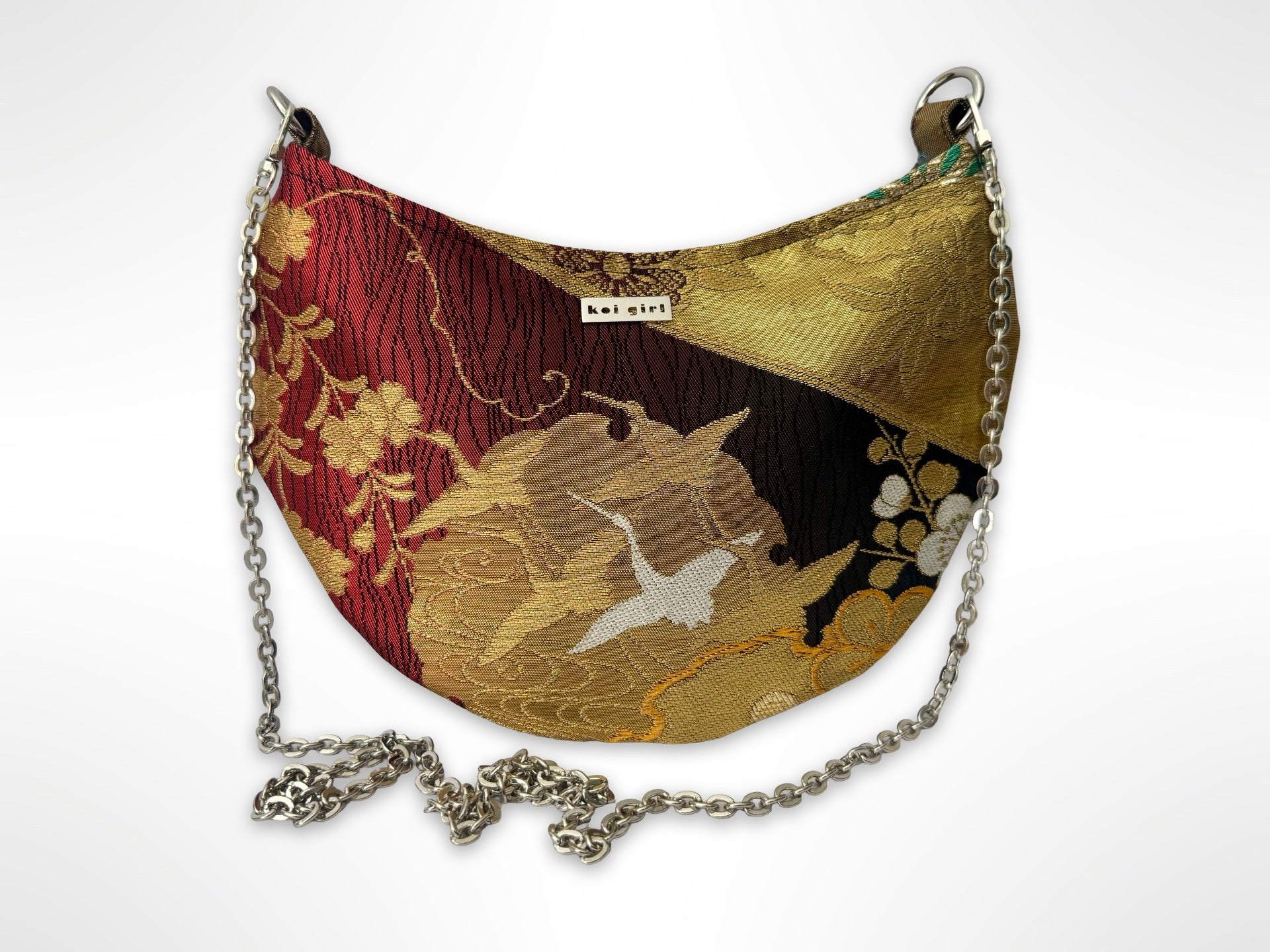One-of-a-kind mini crescent crossbody bag handcrafted from a metallic red and gold vintage silk obi belt, with embroidered flying cranes and floral brocade.