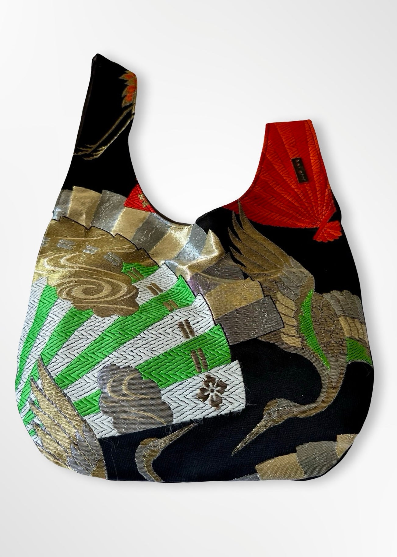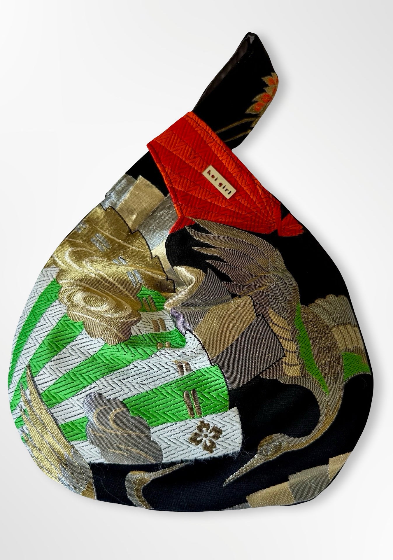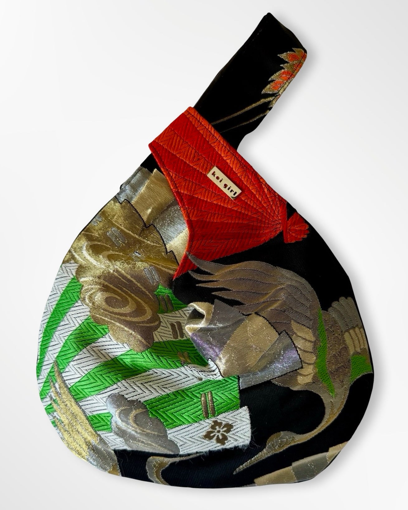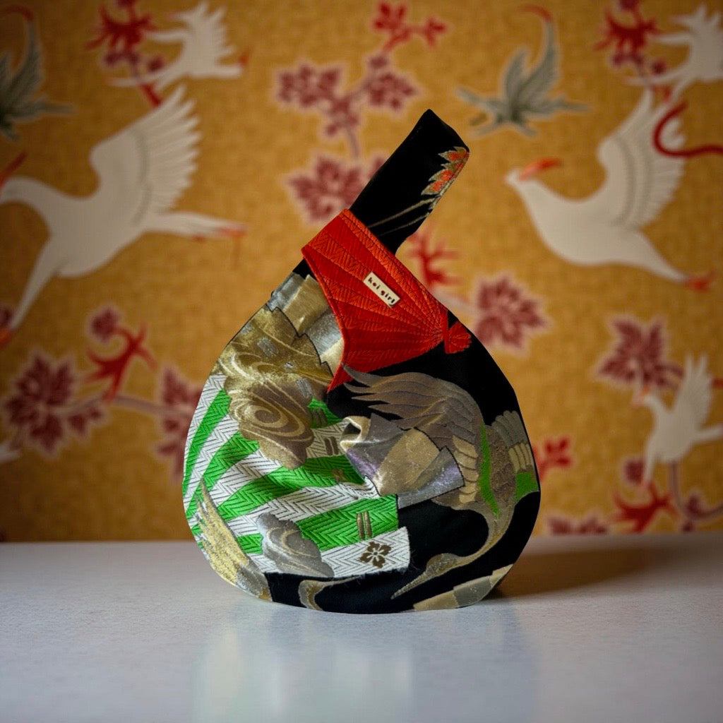 One-of-a-kind round shaped wrist bag handcrafted from a black, with red , green and metallic gold flying cranes. Repurposed from a vintage silk obi belt.
