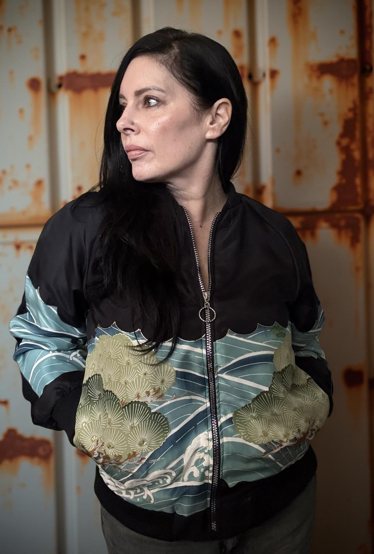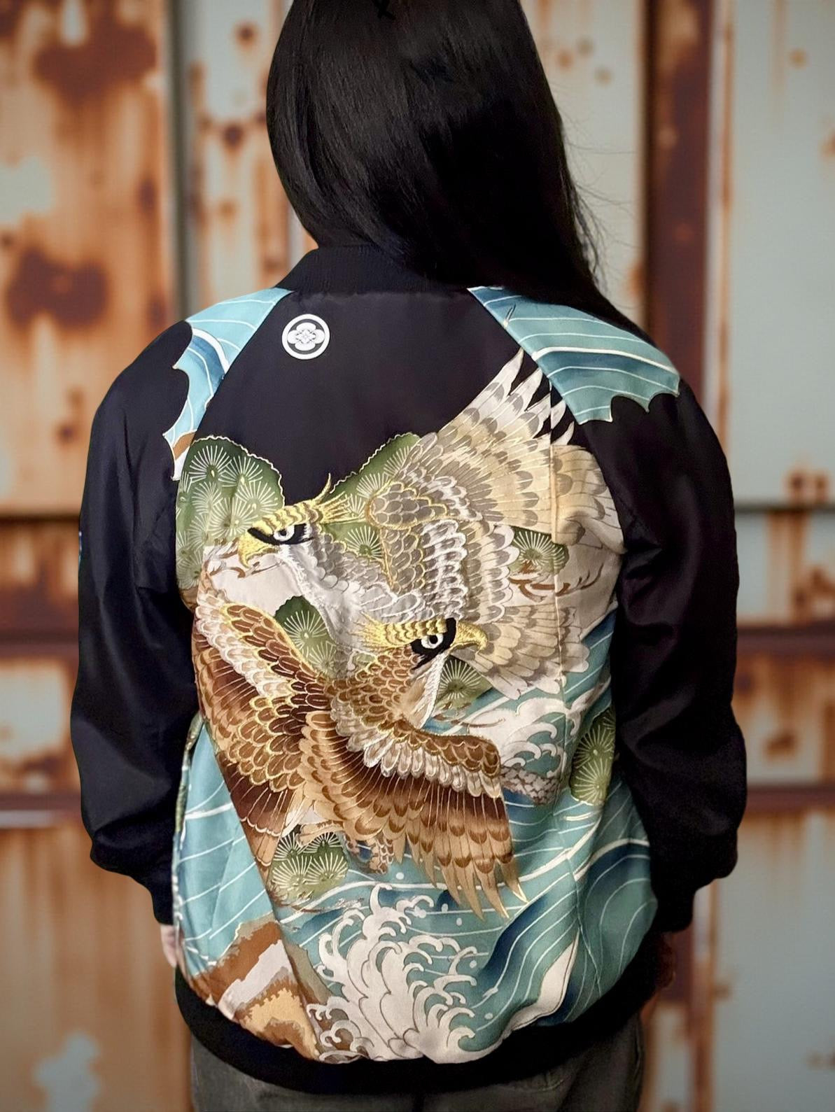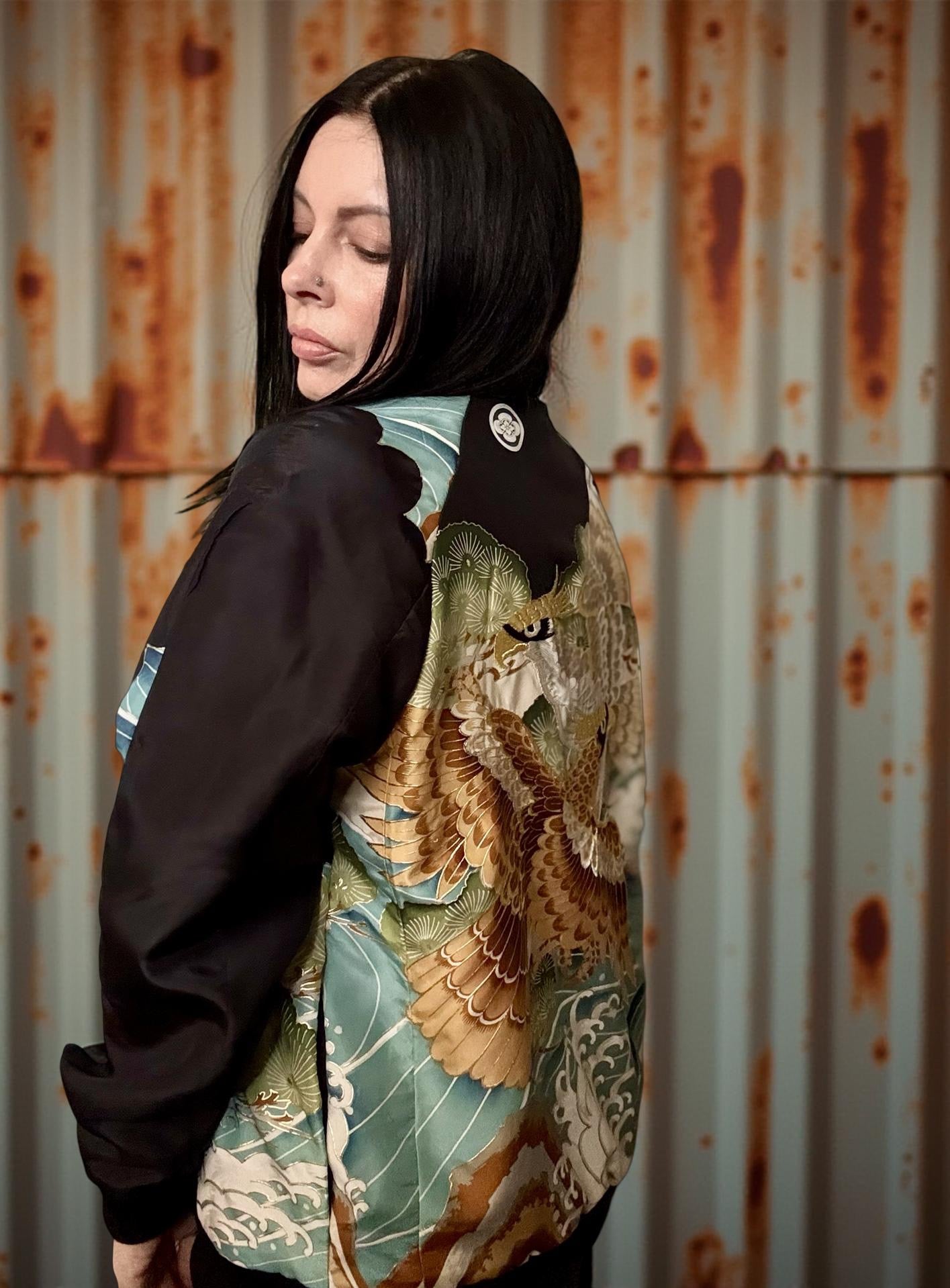 A one-of-a-kind lightweight bomber jacket, repurposed from a vintage silk boys kimono. This jacket has a striking pair of flying hawks design on the back, with ocean waves and pine trees on the sleeves over a plain black. It is fully lined with white vintage silk, the same lining as the kimono.