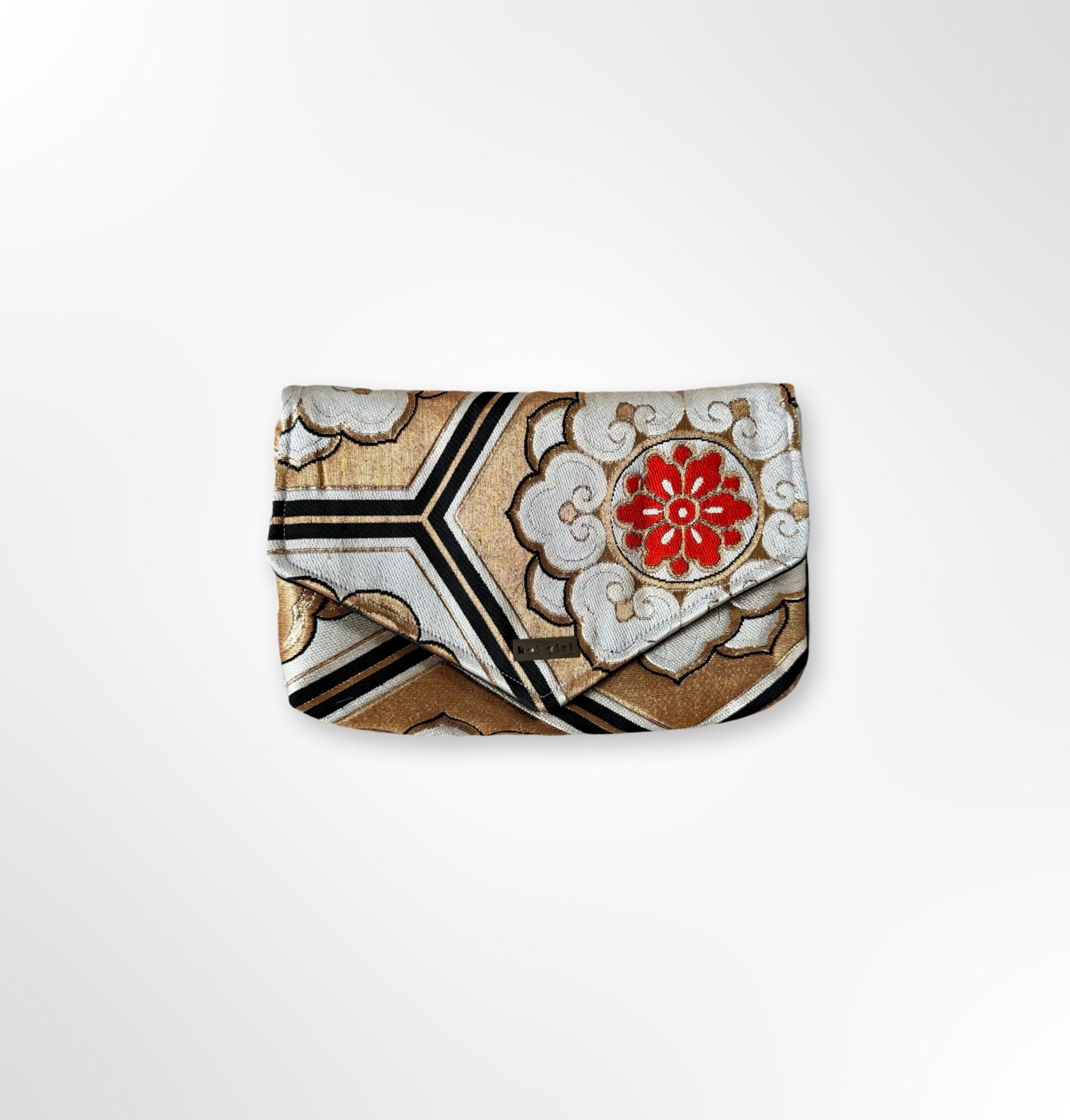 Rectangular metallic gold clutch purse with an embroidered floral design and geometric kikkou pattern in black, red and white. This clutch is repurposed from a vintage silk obi belt, it is one of a kind. The back of this clutch is a plain black silk from the same obi belt.