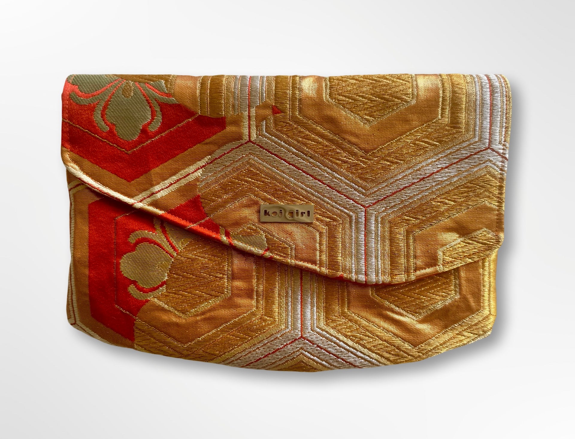 Gorgeous orange clutch purse with embroidered metallic gold kikkou (hexagon) design. This clutch purse is repurposed from a vintage silk obi belt, it is one of a kind.