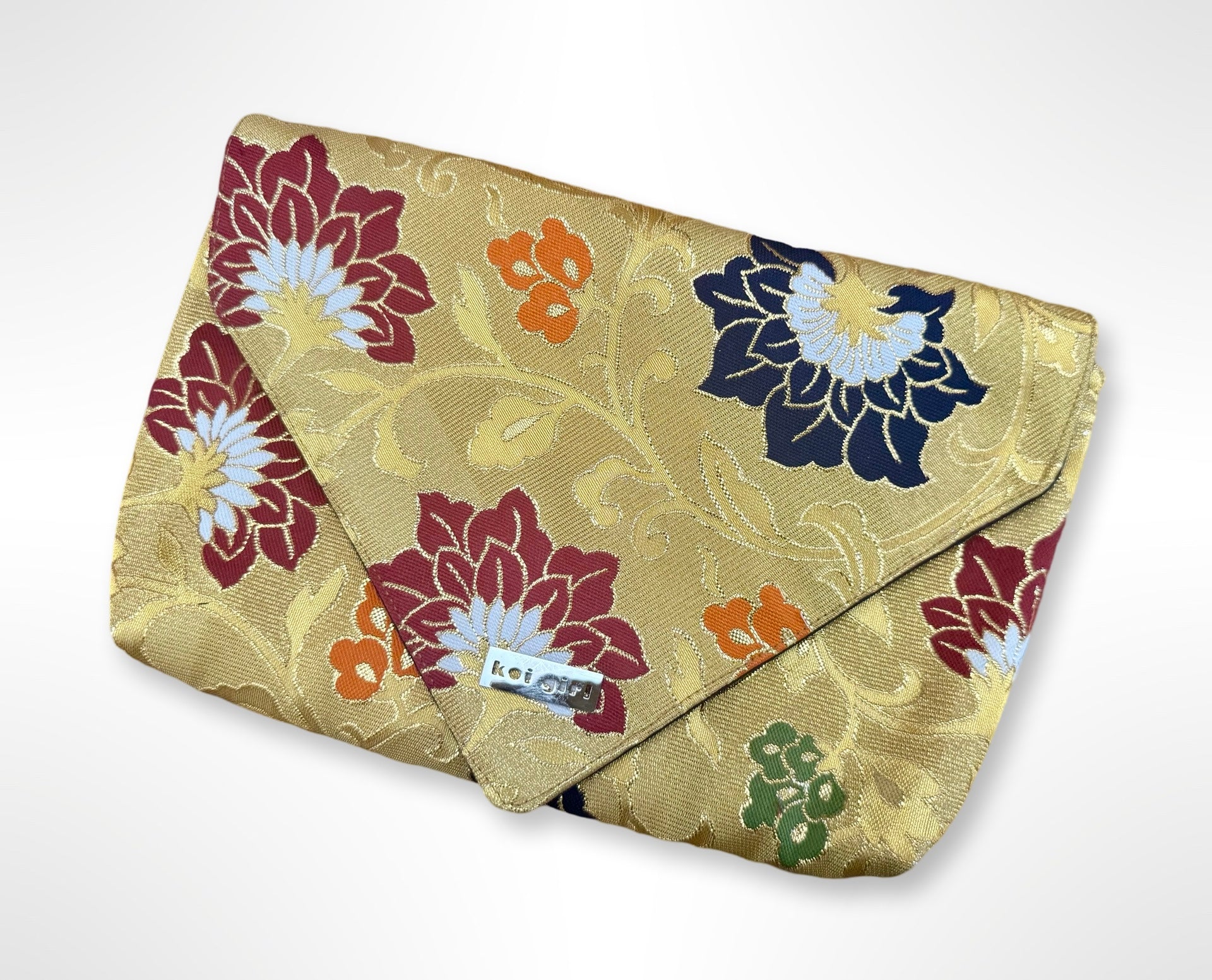 This exquisite metallic gold clutch purse is crafted from upcycled vintage silk obi fabric, making each piece truly unique. Featuring intricate leaf brocade with peonies in red, blue and orange, it’s a timeless accessory that combines traditional Japanese craftsmanship with contemporary style.