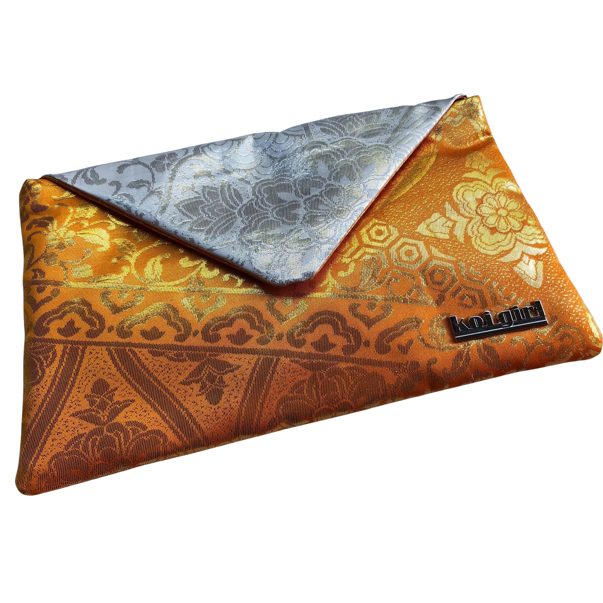 Bright and beautiful orange and silver clutch purse made from a vintage silk obi belt in a mandala design.
