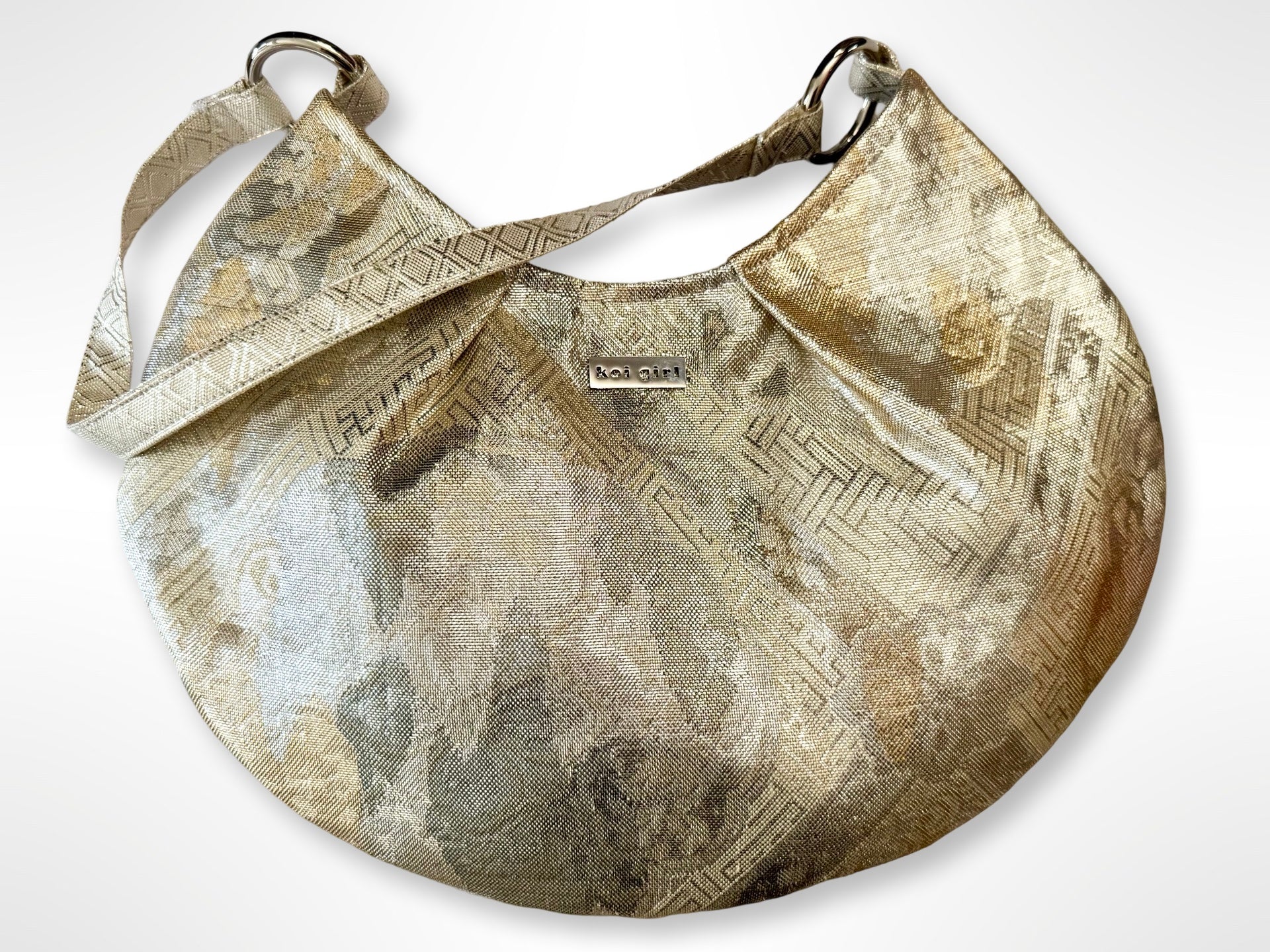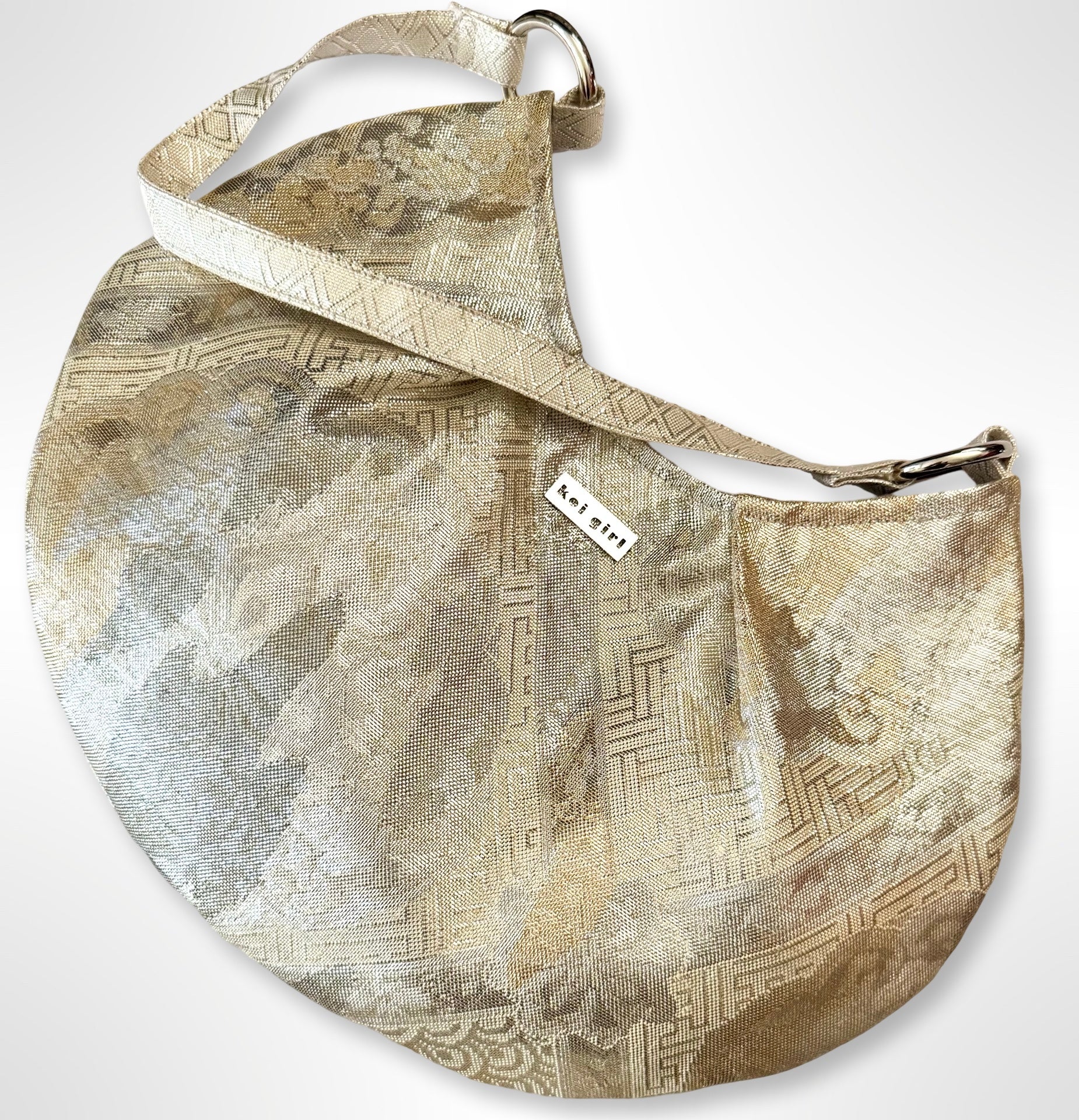 This exquisite silver crescent shoulder bag is crafted from upcycled vintage silk obi fabric, making each piece truly unique. Featuring intricate gold and silver geometric and floral-patterned brocade, it’s a timeless accessory that combines traditional Japanese craftsmanship with contemporary style.
