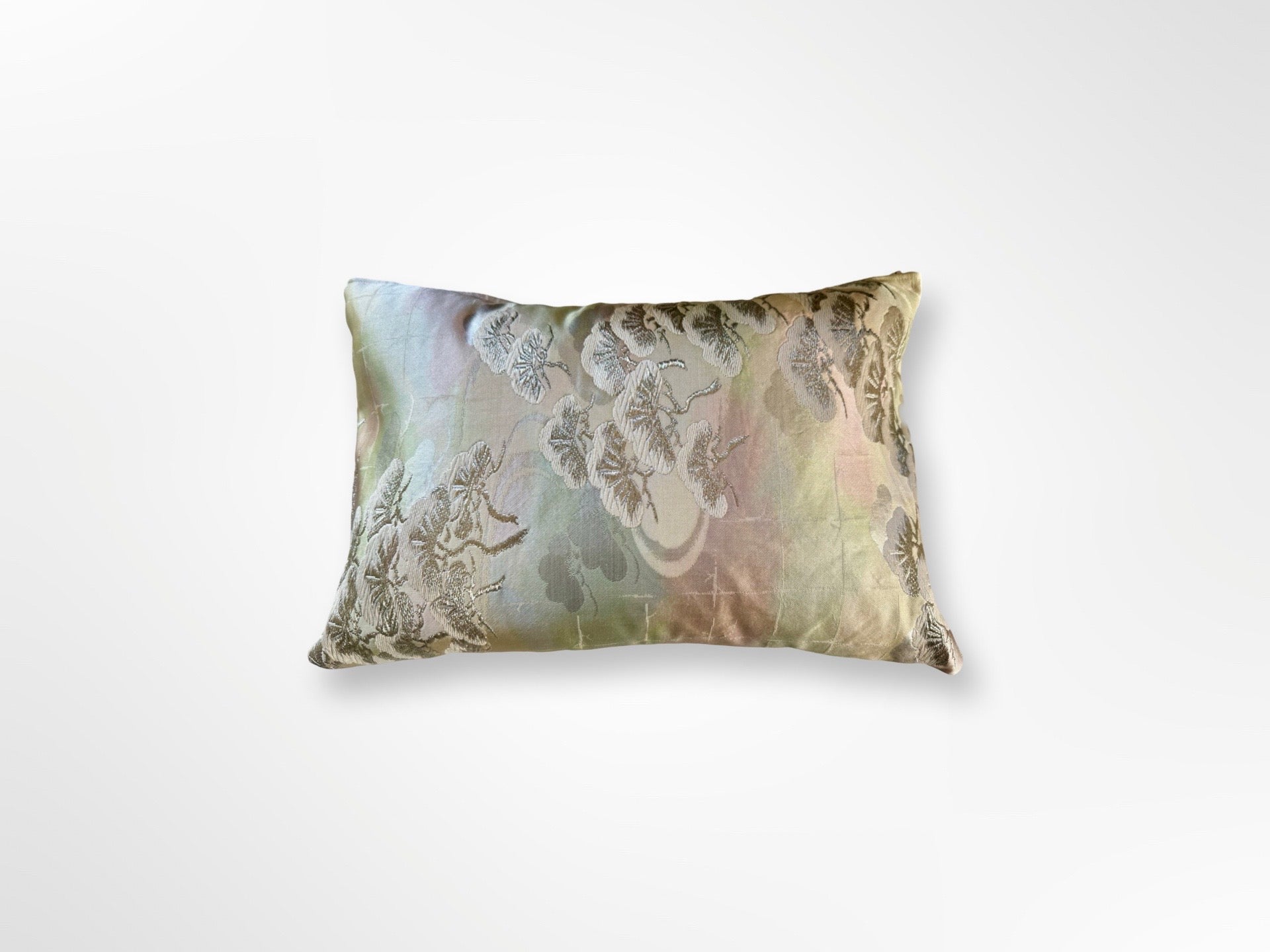 A stunning decorative cushion, repurposed from a vintage silk obi belt in white, pale pink and green, with metallic silver embroidered pine trees.