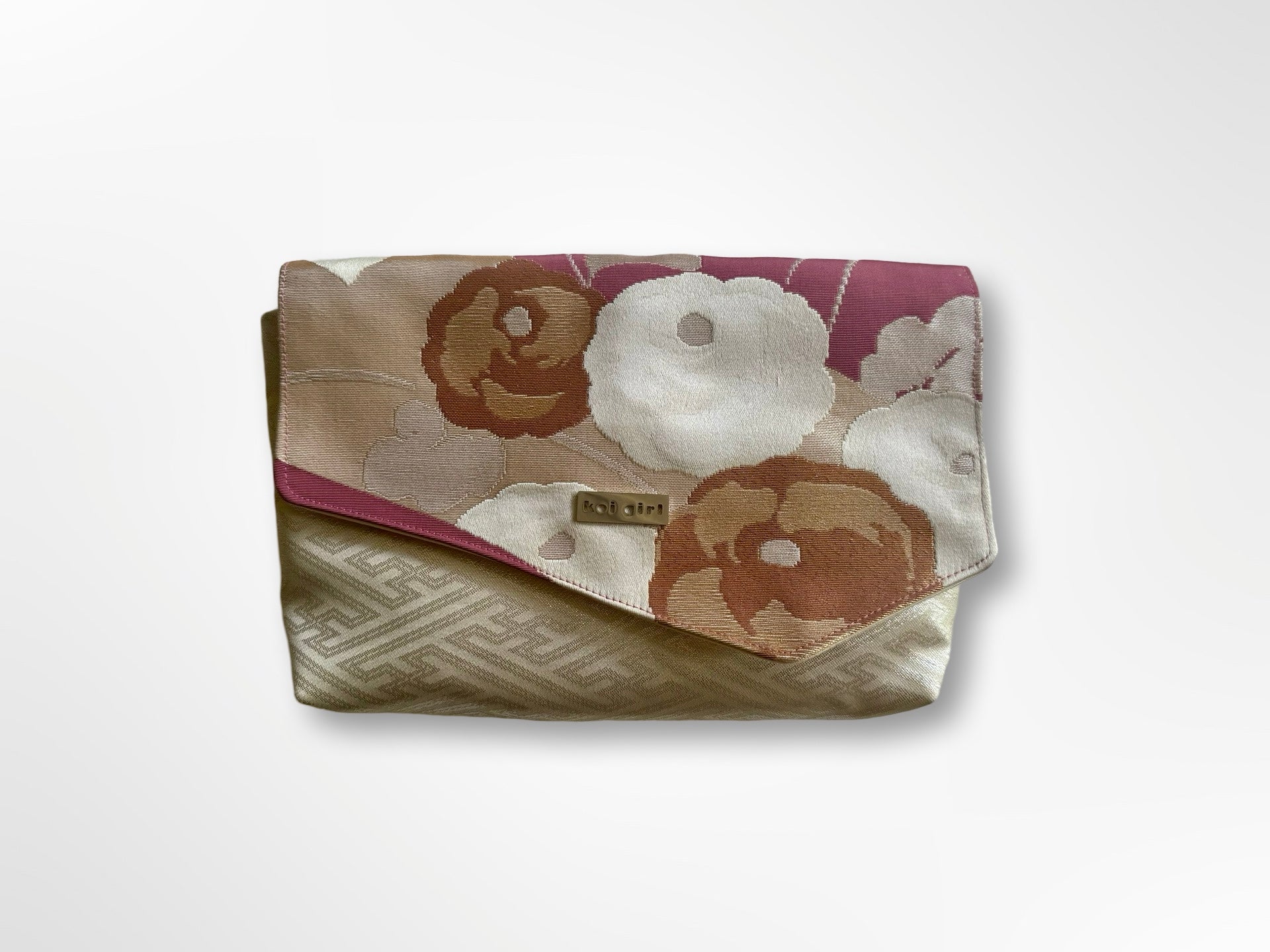 Stunning pink, silver and gold clutch purse with white and gold peony brocade. This clutch purse is repurposed from a vintage silk obi belt, it is one of a kind.