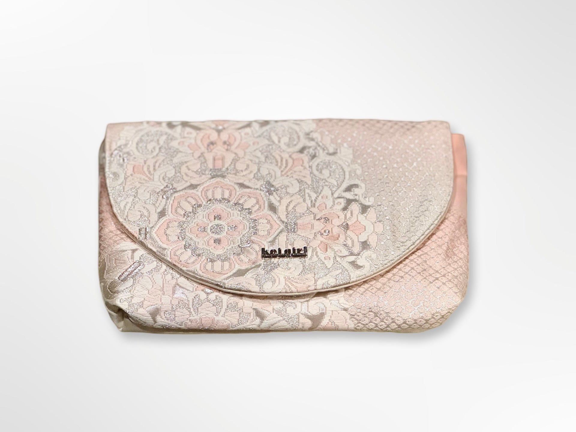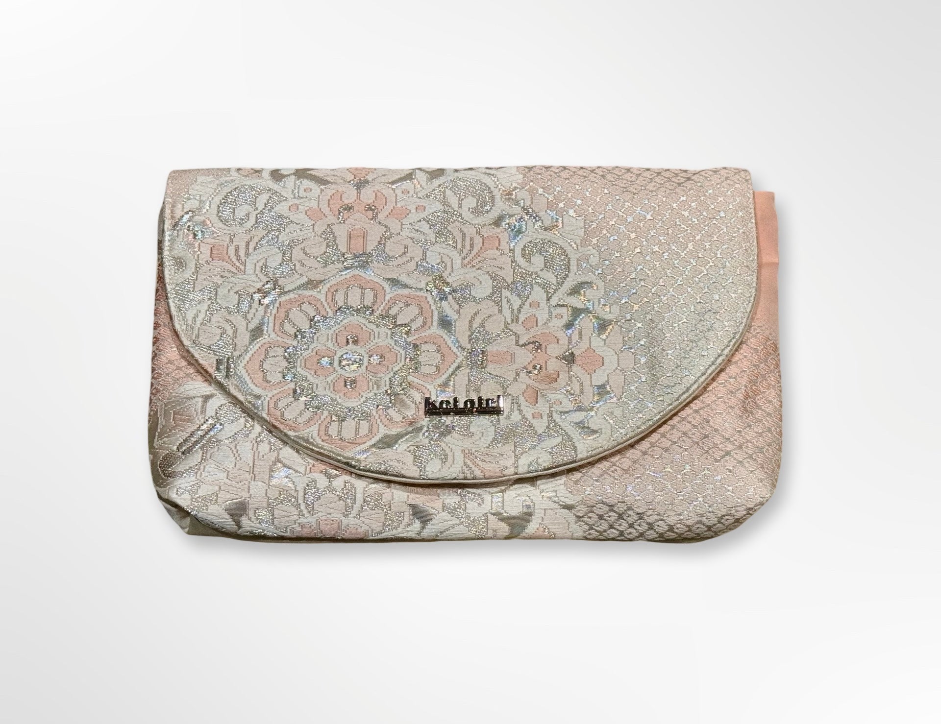 Rectangular clutch purse in a pale pink, white and silver embroidered mandala floral brocade. This clutch is repurposed from a vintage silk obi belt, it is one of a kind. The back of this clutch is a plain ivory silk from the same obi belt.