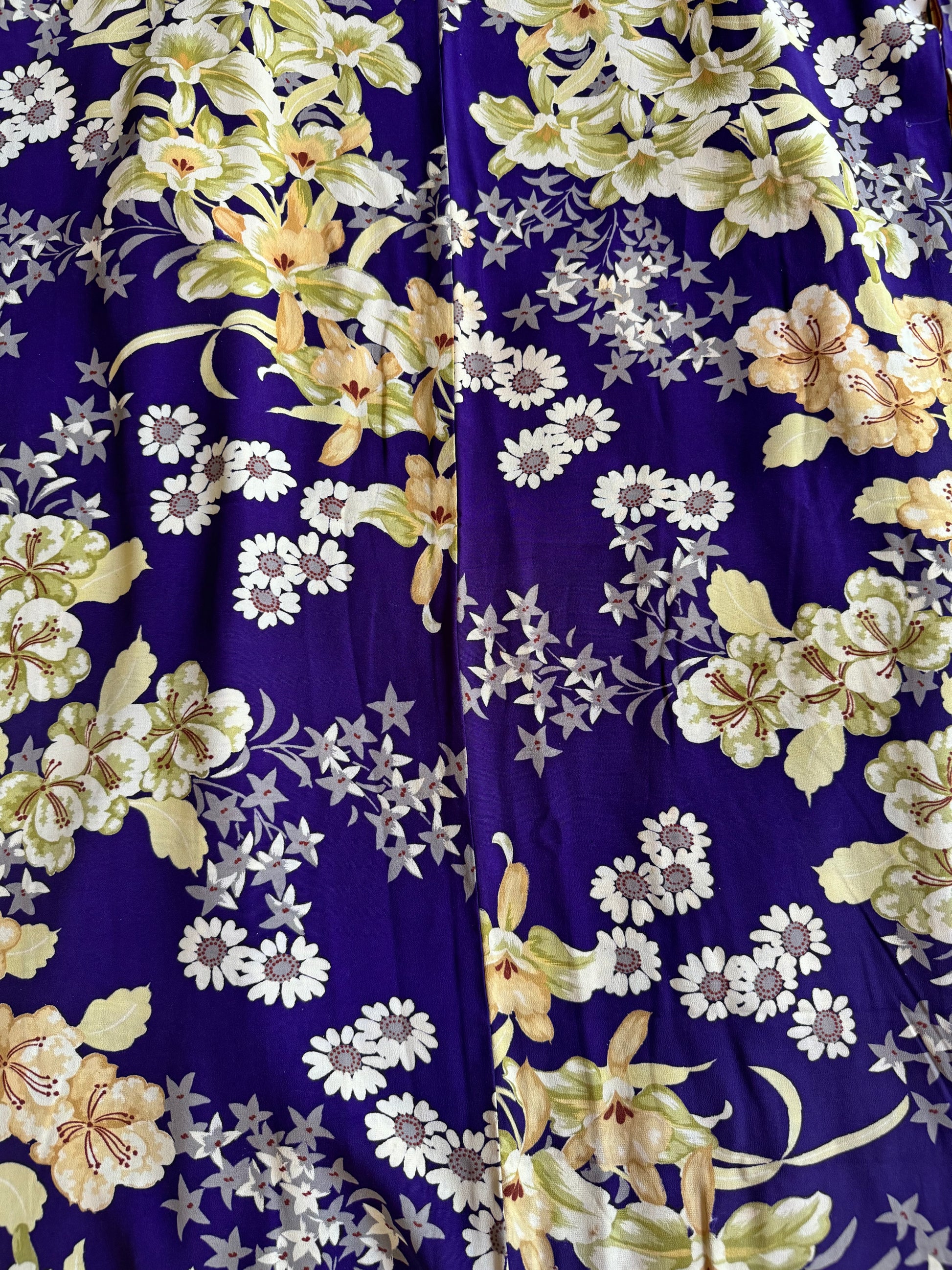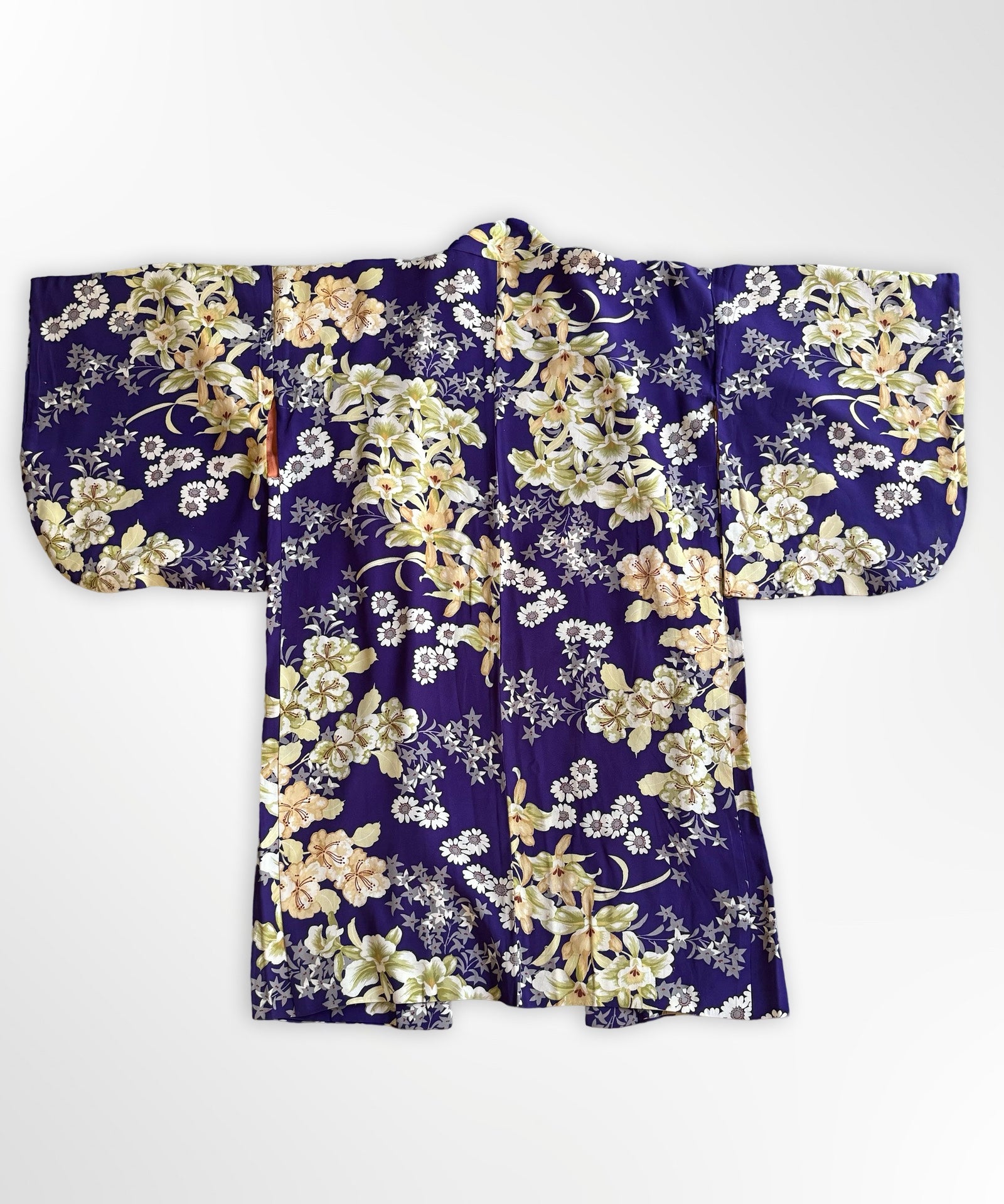 Beautiful longer length purple vintage silk haori jacket with white, grey and cream Japanese floral print. The lining is a contrasting pale orange vintage silk with a woven peony pattern.