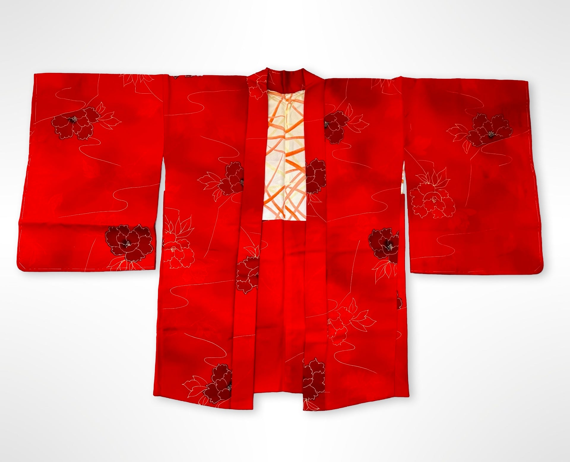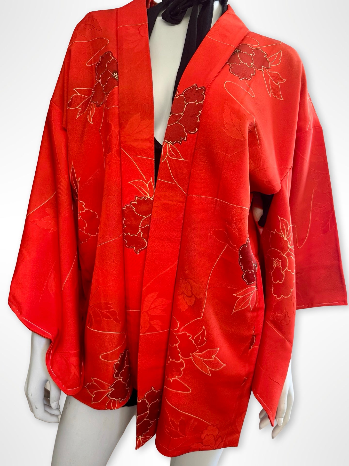Gorgeous vintage silk Haori jacket with printed red peonies.