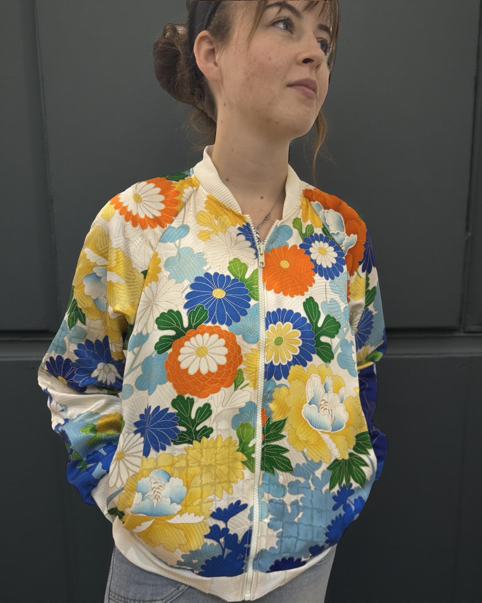 A one-of-a-kind lightweight bomber jacket, repurposed from a vintage silk kimono with yellow, blue, orange and green printed peony, chrysanthemum and blossoms, and stunning metallic gold and silver embroidered highlights. It is fully lined with white vintage silk, the same lining as the kimono.