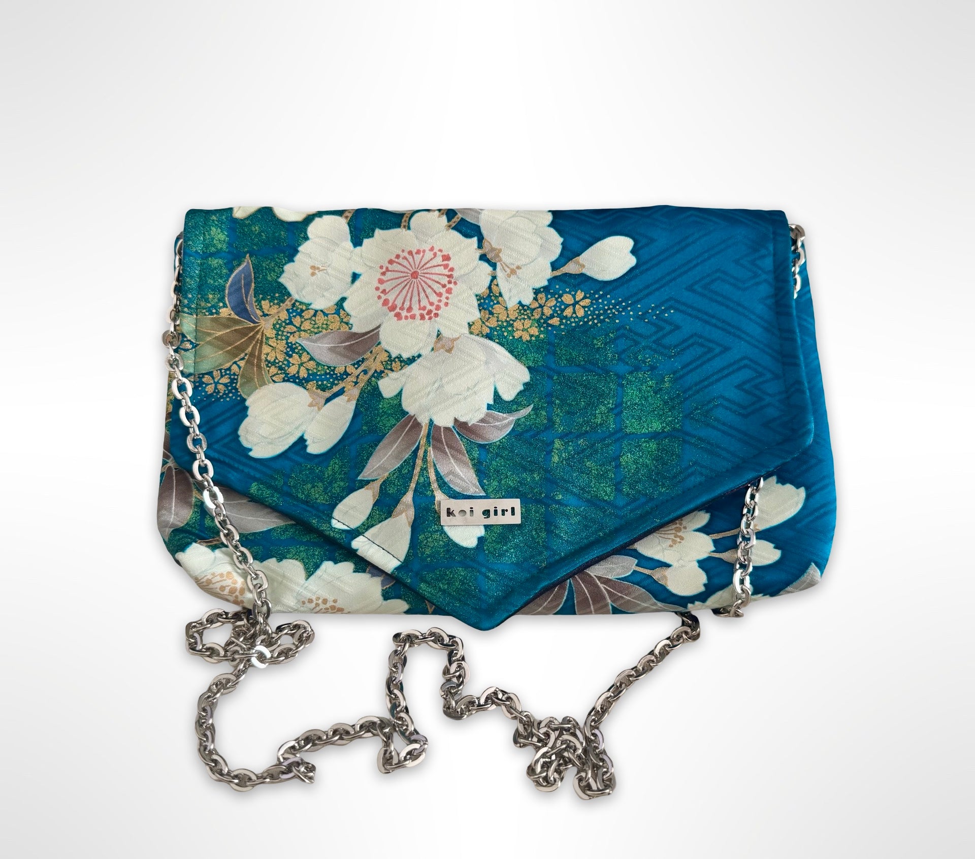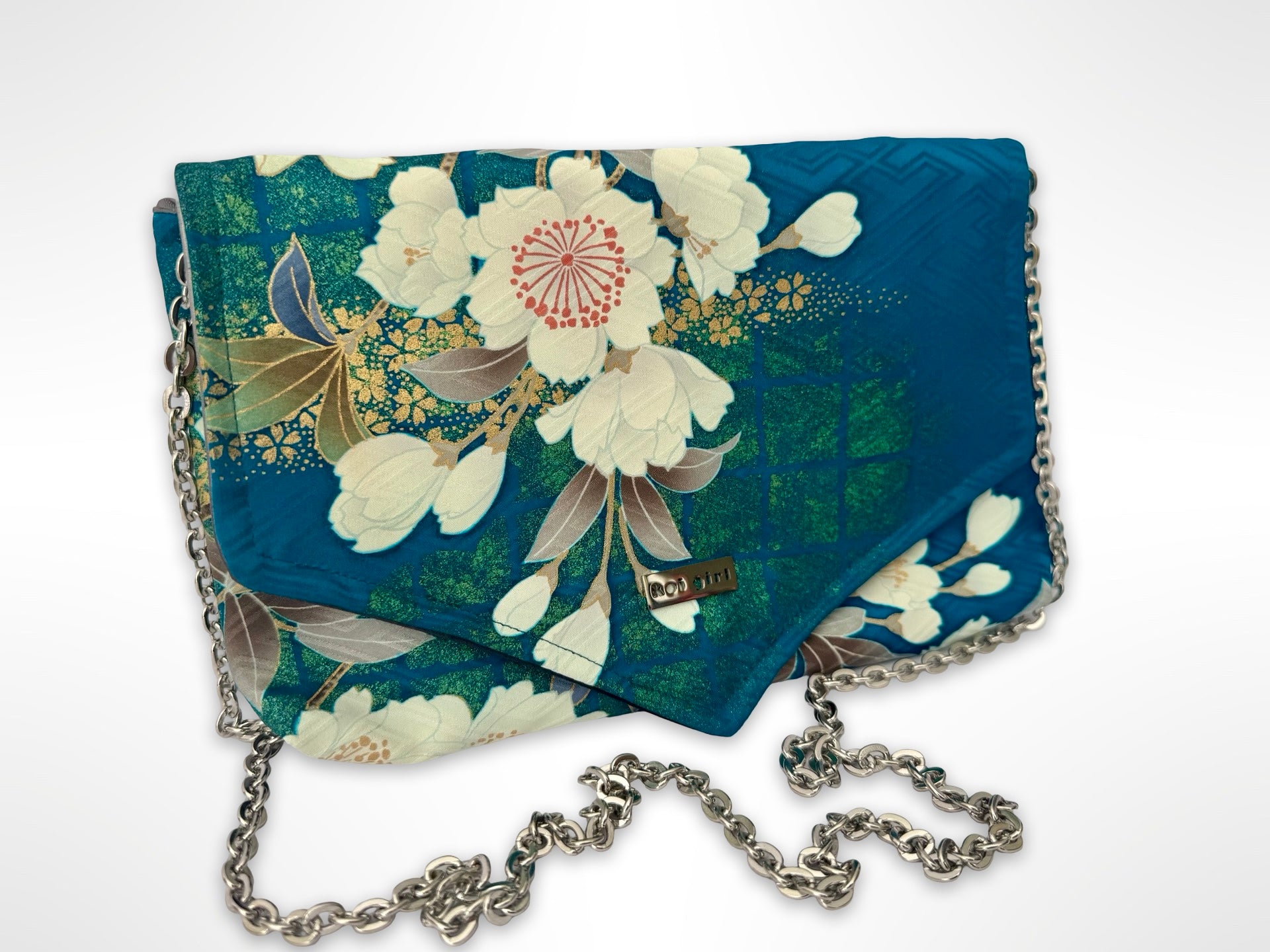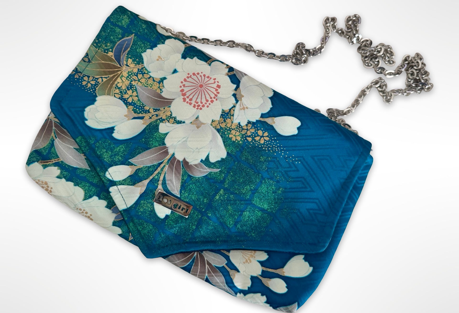 This teal with blossoms clutch purse is crafted and upcycled by repurposing vintage silk kimono fabric, making each piece truly unique. Featuring a a stunning metallic peony flower scene, it’s a timeless accessory that combines traditional Japanese craftsmanship with contemporary style.
