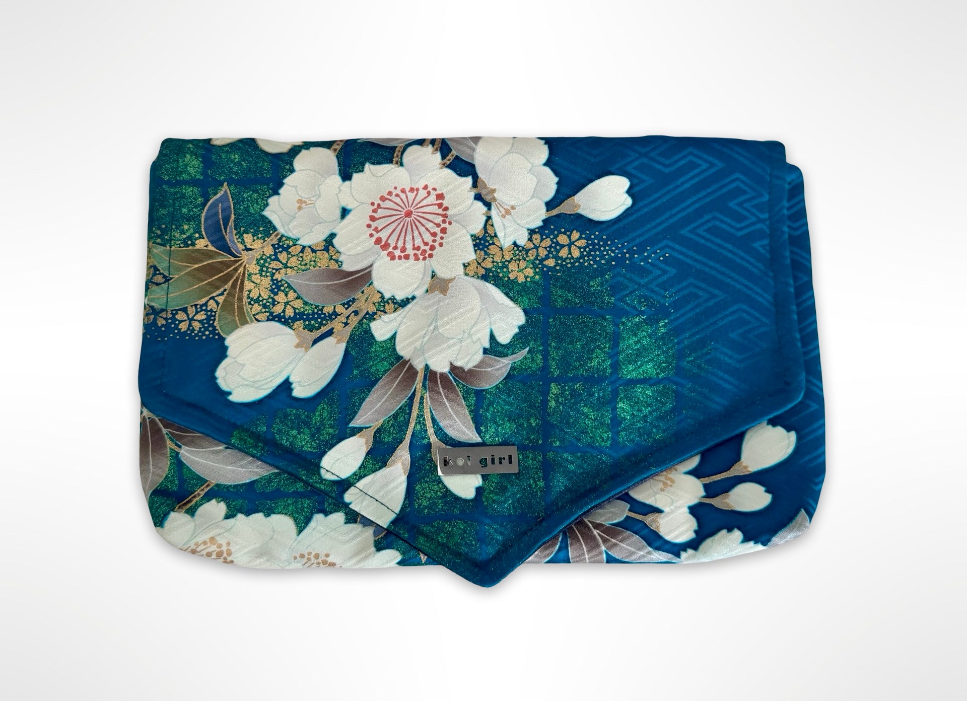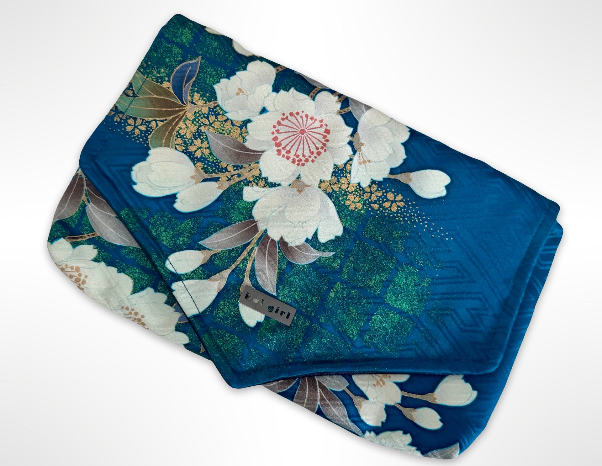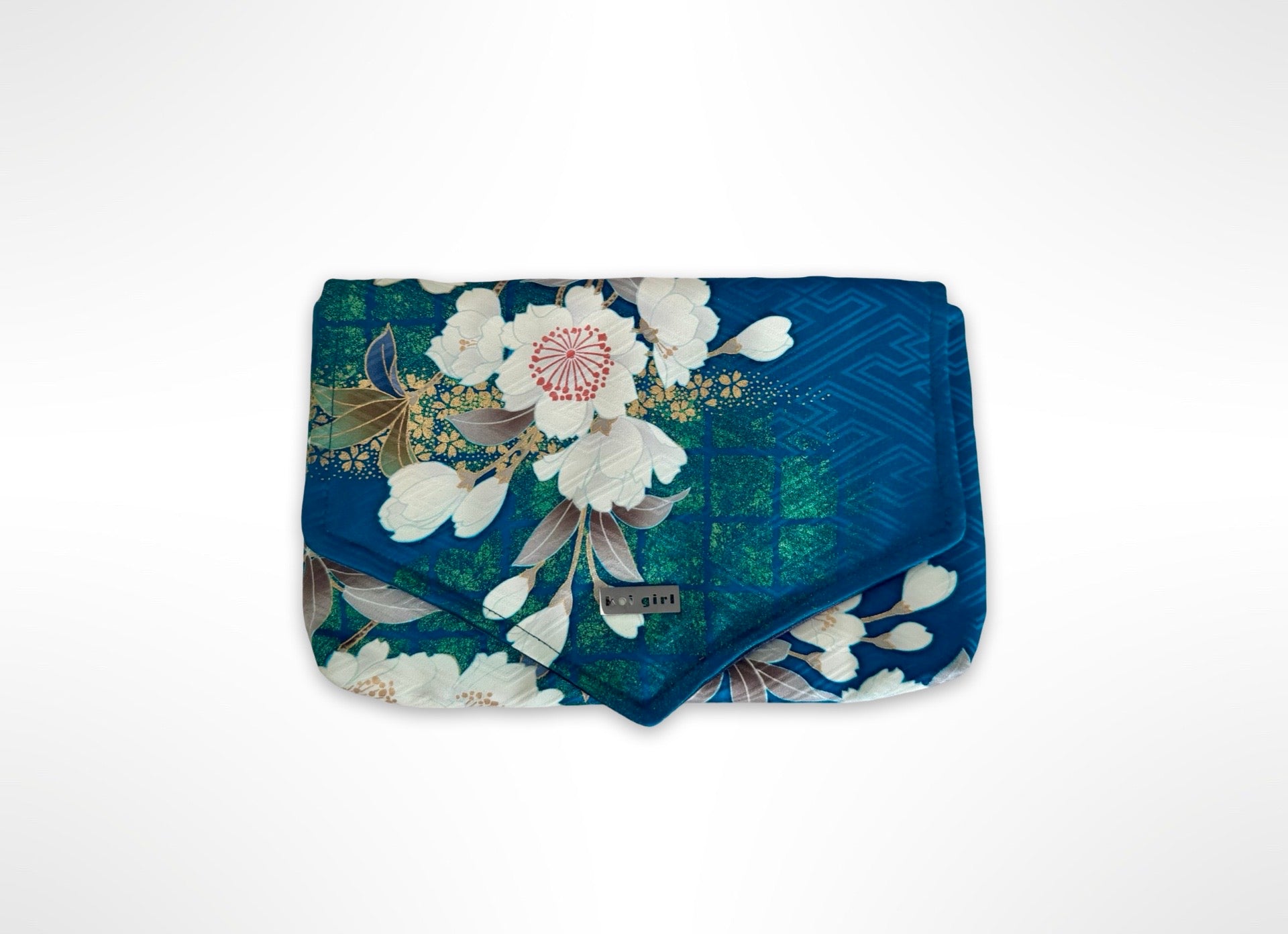 This teal with blossoms clutch purse is crafted and upcycled by repurposing vintage silk kimono fabric, making each piece truly unique. Featuring a a stunning metallic peony flower scene, it’s a timeless accessory that combines traditional Japanese craftsmanship with contemporary style.